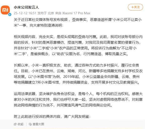 馮玉寬發(fā)現(xiàn)情況不對(duì),馬上發(fā)了個(gè)道歉視頻,說連“小米”這兩個(gè)字都不讓用了,感覺被大公司欺負(fù)了,他還清空了賬號(hào)改了名字,情緒很激動(dòng),小米這邊很快回應(yīng),說投訴的是模仿雷軍形象和丑化高管的行為,不是針對(duì)“小米”這個(gè)詞的使用,他們說明,“小米”作為糧食名稱誰都能用,但用企業(yè)品牌那種包裝方式去賣貨,容易讓人誤會(huì),這就越界了。