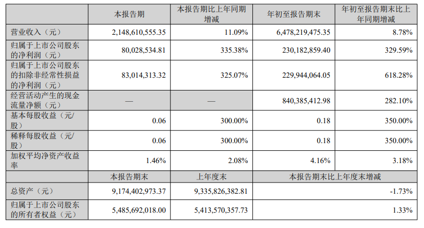 報(bào)告顯示,中順潔柔前三季度營(yíng)業(yè)收入為64.78億元,同比增長(zhǎng)8.78%;歸母凈利潤(rùn)為2.30億元,同比增長(zhǎng)329.59%;扣非歸母凈利潤(rùn)為2.30億元,同比增長(zhǎng)618.28%;基本每股收益0.18元。