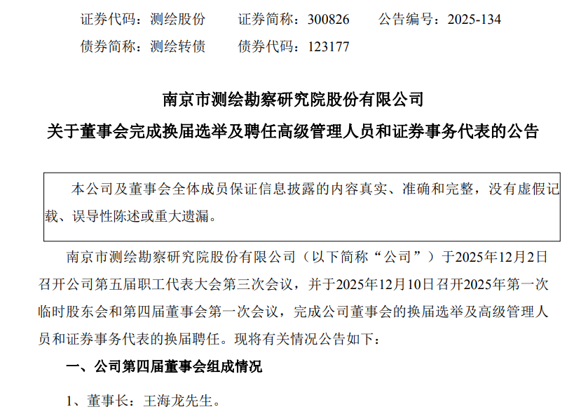 公告顯示,南京市測繪勘察研究院股份有限公司12月2日召開第五屆職工代表大會第三次會議。12月10日,其再次召開2025年第一次臨時股東會和第四屆董事會第一次會議,完成董事會換屆選舉以及高級管理人員和證券事務代表換屆聘任。