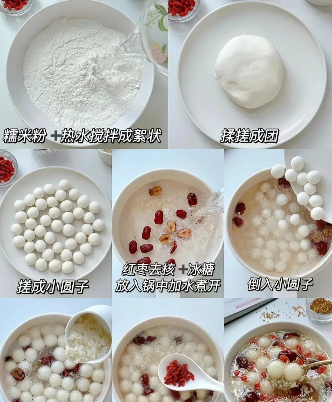 煮的時(shí)候水里可以先放幾顆紅棗和桂圓肉把味道煮出來。水開下小丸子看它們在鍋里咕嘟咕嘟地浮沉特別治愈。等丸子全部浮起來就說明熟了。這時(shí)候加入酒釀、枸杞再依據(jù)口味加點(diǎn)紅糖煮開一分鐘就好。