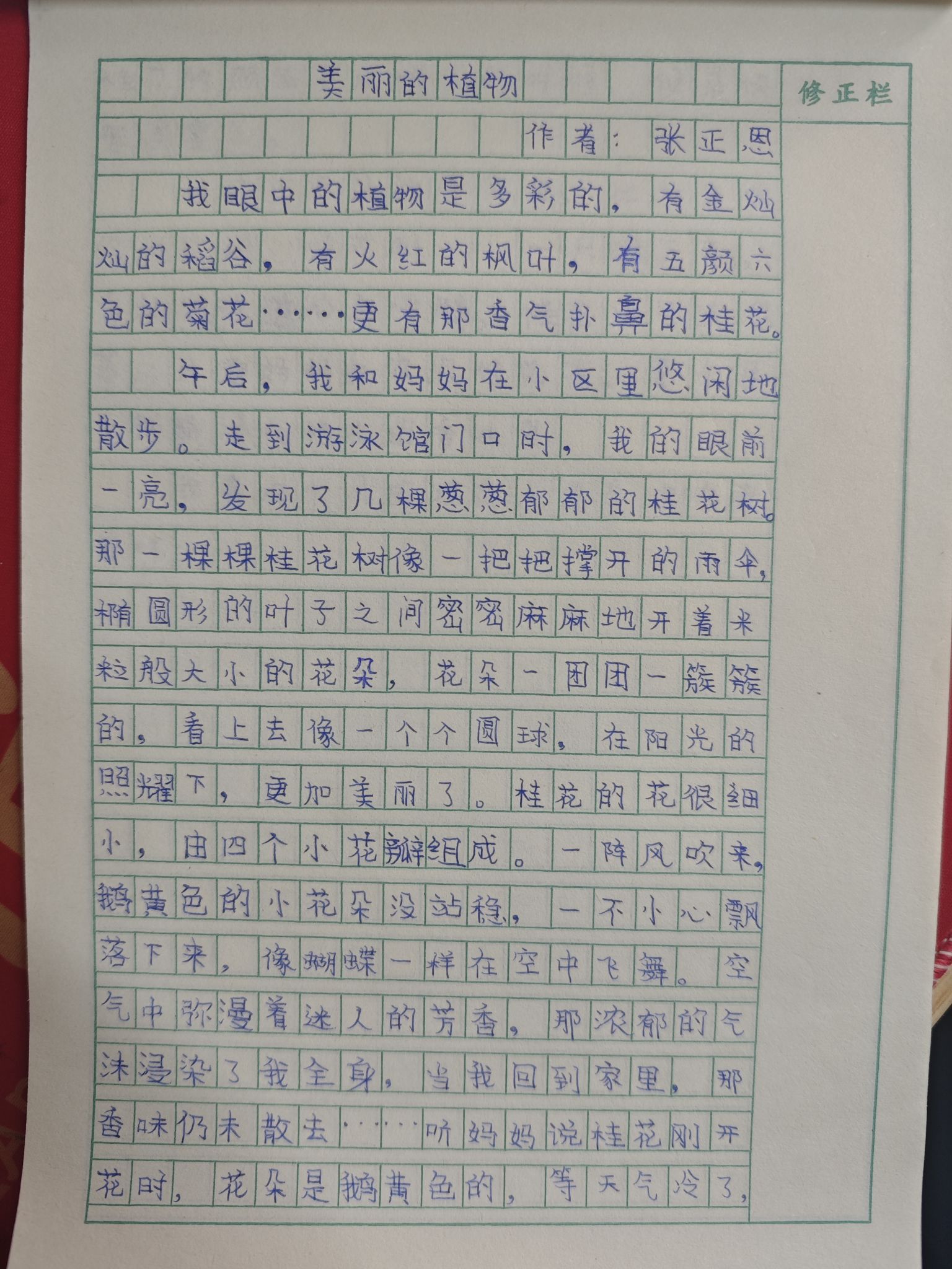 我眼中的植物是多彩的,有金燦燦的稻谷,有火紅的楓葉,有五顏六色的菊花,更有那香氣撲鼻的桂花。