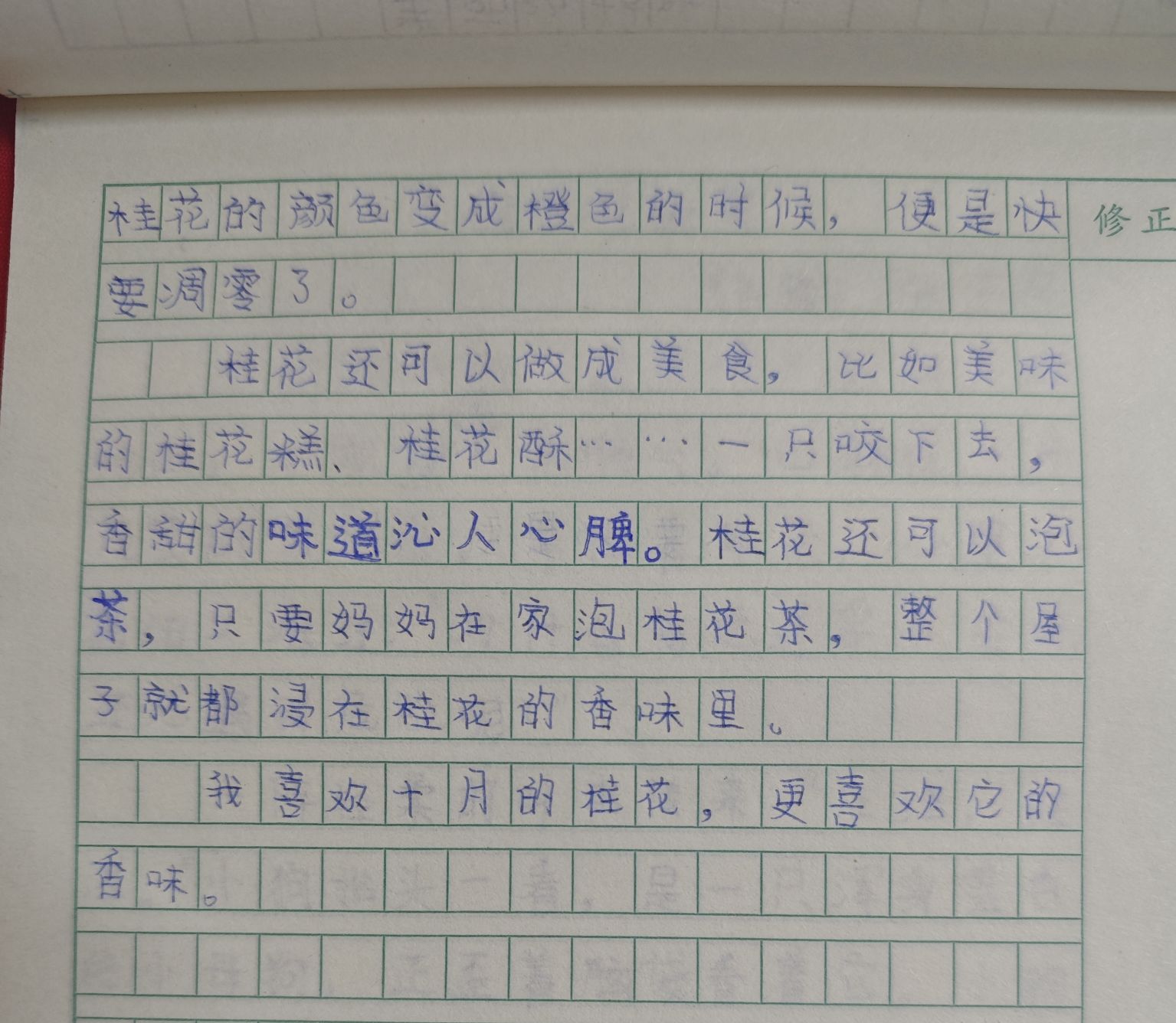 2. 用詞與語法錯誤:“香氣撲鼻的桂花”前的省略號使用不當,改為逗號更合適;“照耀下”前可加“陽光”,改為“在陽光的照耀下”更通順;“彌漫著迷人的芳香”與“濃郁的氣息浸染了我全身”表述稍顯重復,可精簡;“浸在桂花的香味里”的“浸”可改為“裹”,更具畫面感。