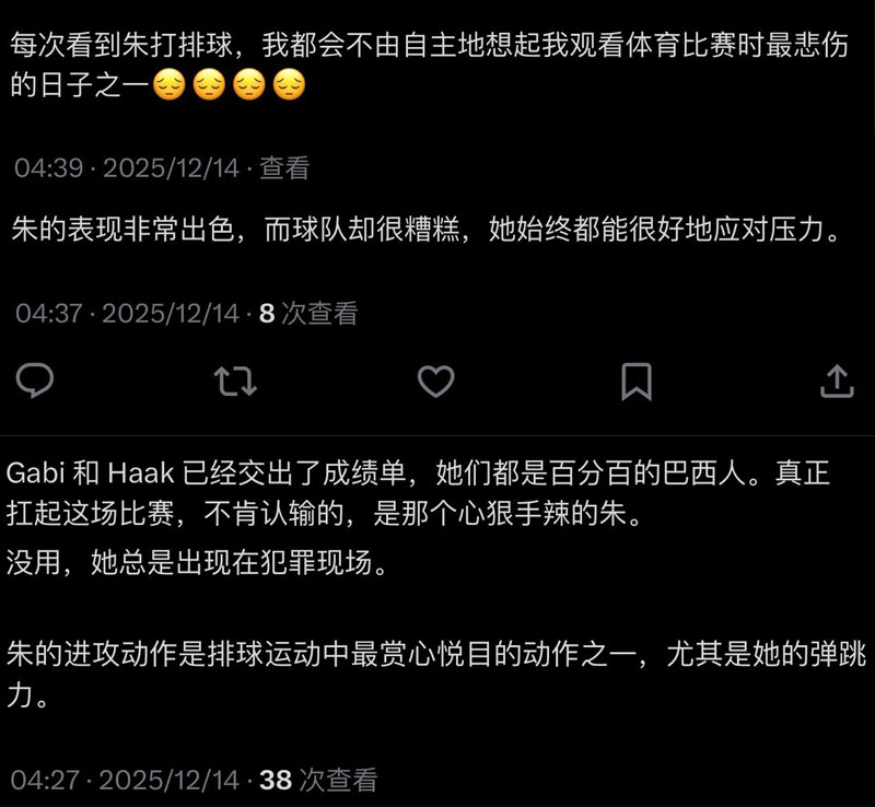 2025年女排世俱杯半決賽結束。中國球員朱婷所在的科內利亞諾以3-1擊敗東道主奧薩斯科和斯坎迪奇會師決賽,四局比分為21-25/25-23/25-15/25-16。此役,朱婷發揮了定海神針的作用,神勇發揮更是征服了巴西球迷。