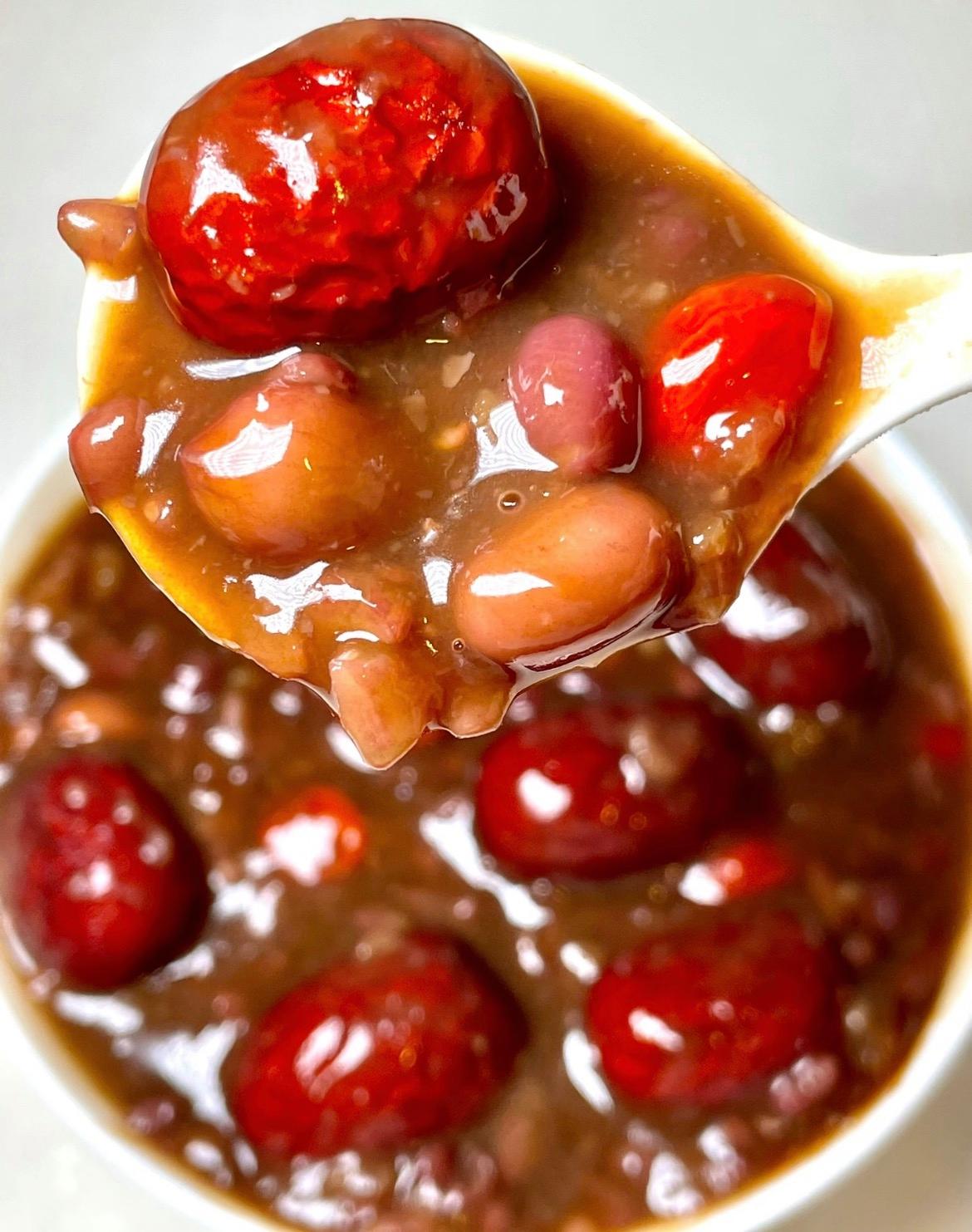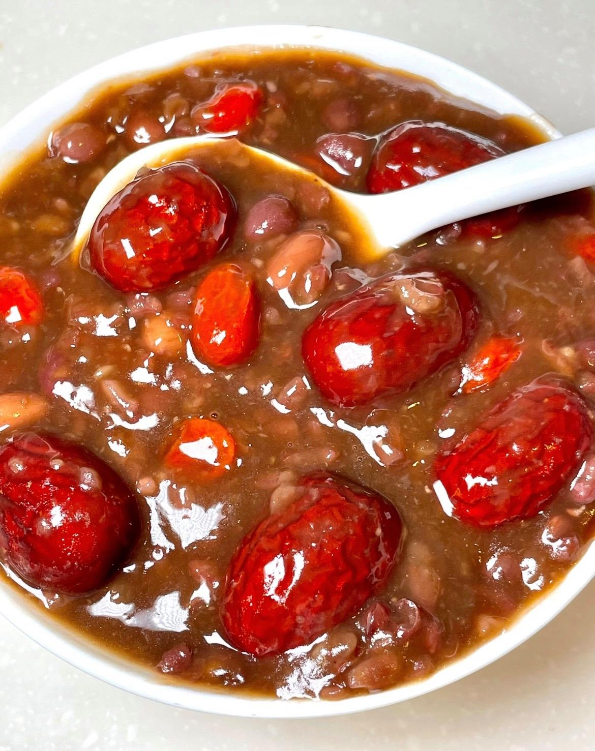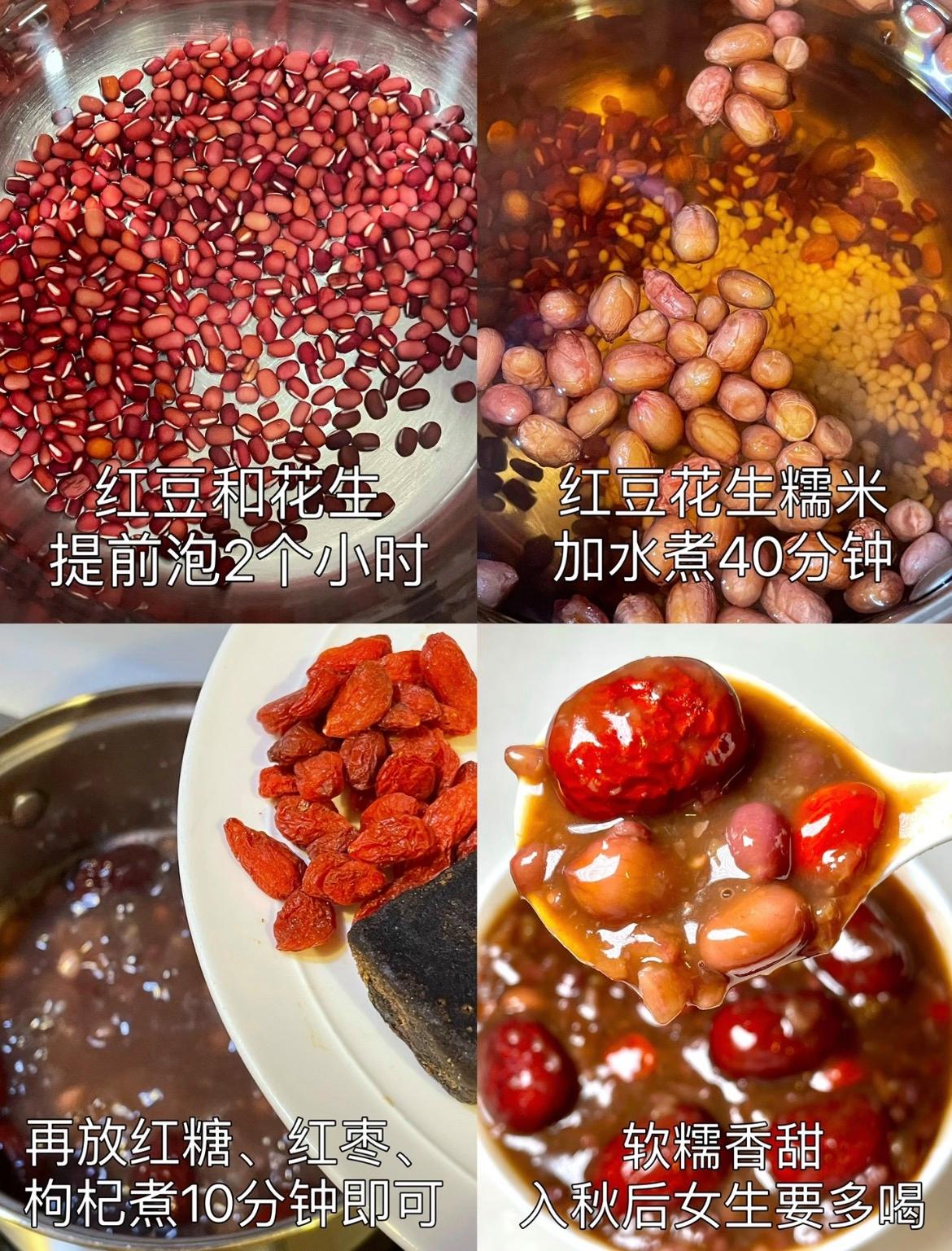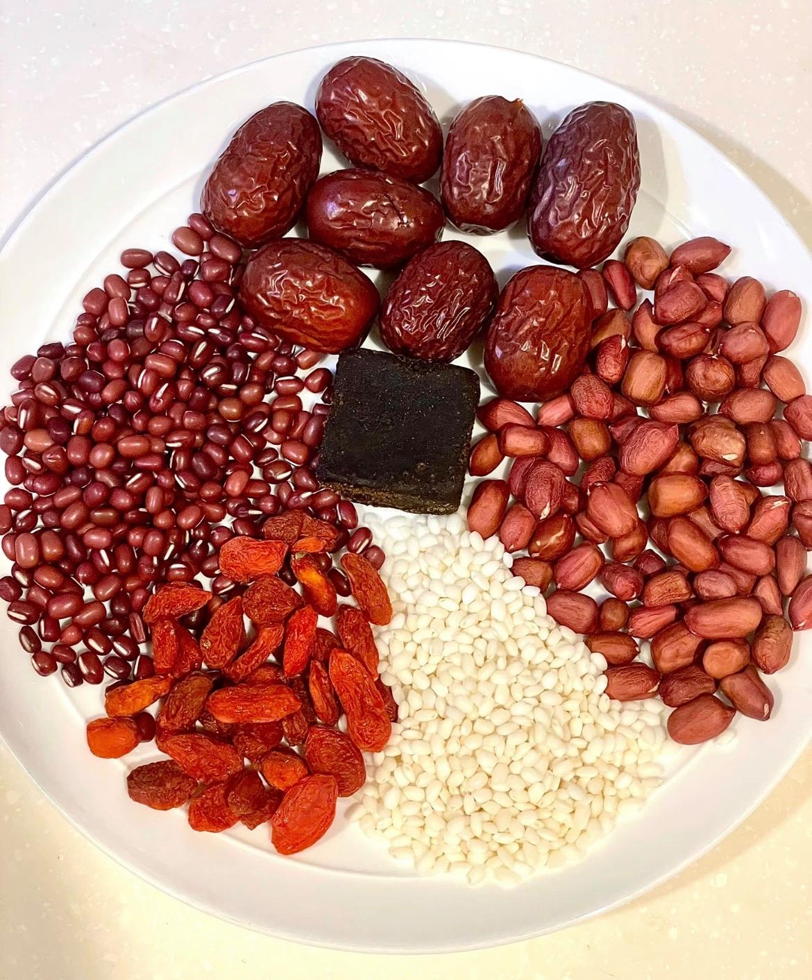 紅豆:60克、紅皮花生:30克、糯米:30克、紅棗:6-8顆、紅糖:20-30克、枸杞:1小把