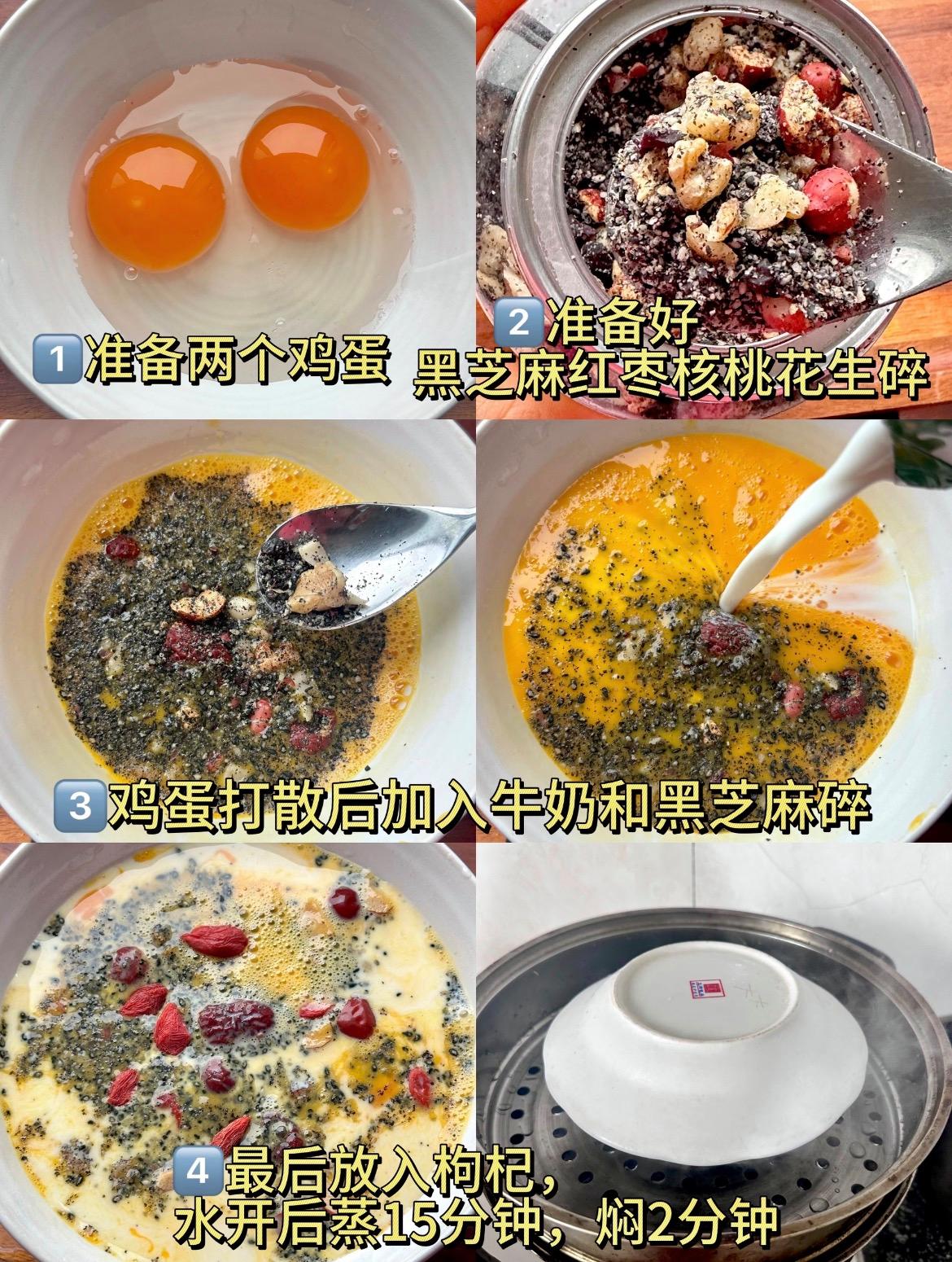 雞蛋:2個、牛奶:約150ml、熟黑芝麻粉:1大勺、紅棗:3-4顆、核桃仁、熟花生:各1小把、枸杞:10余粒、白糖或蜂蜜:可選,根據口味添加