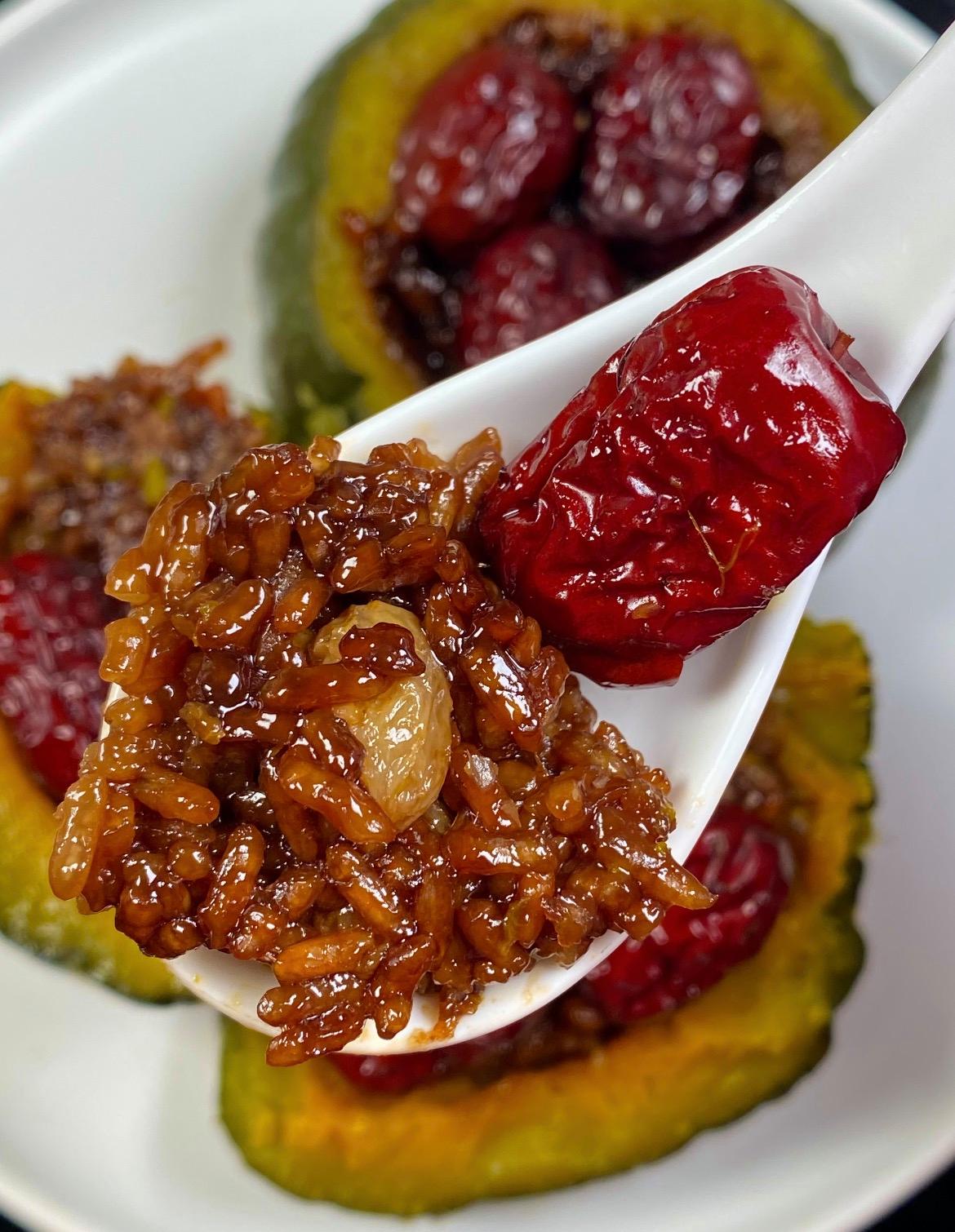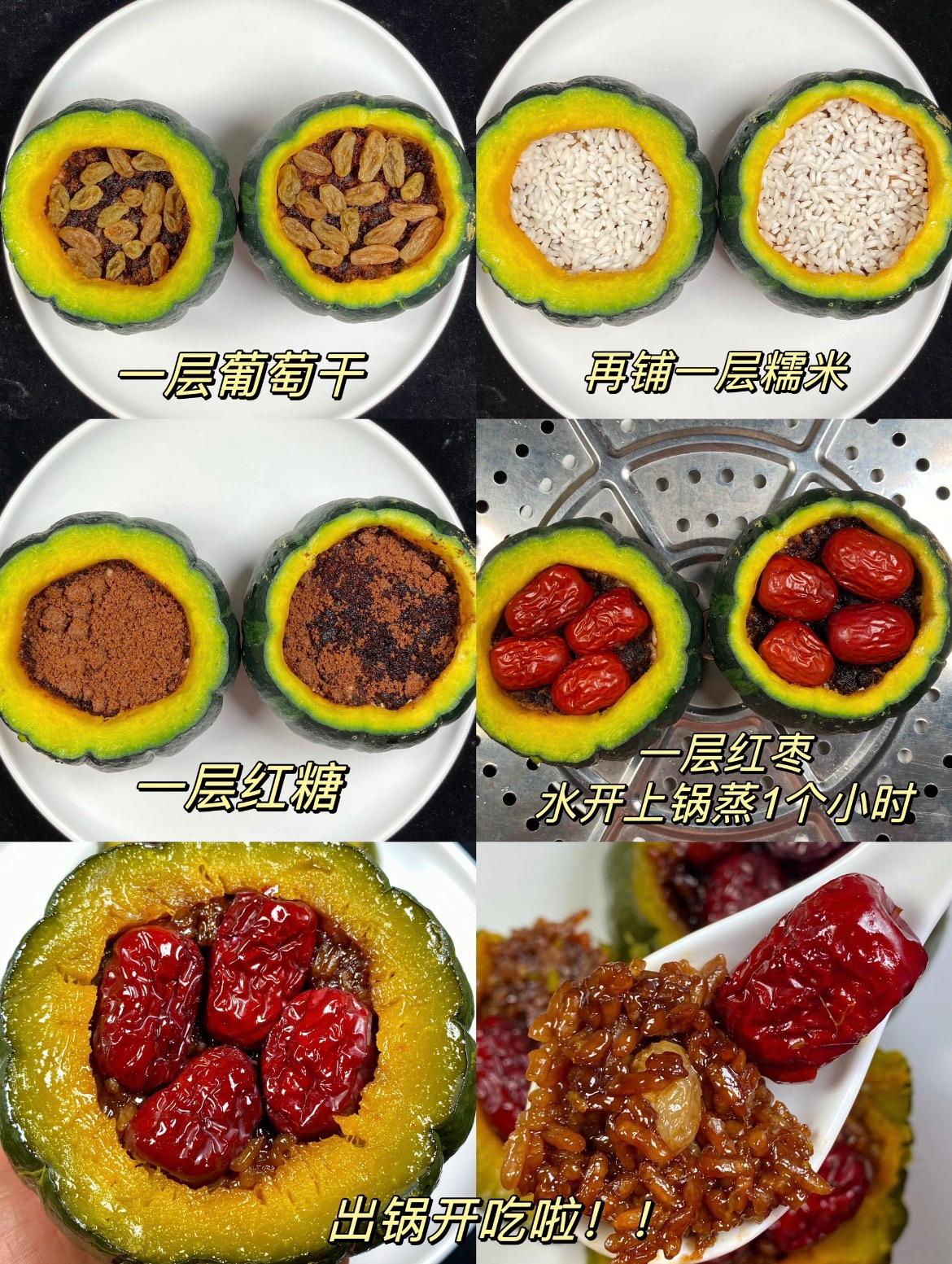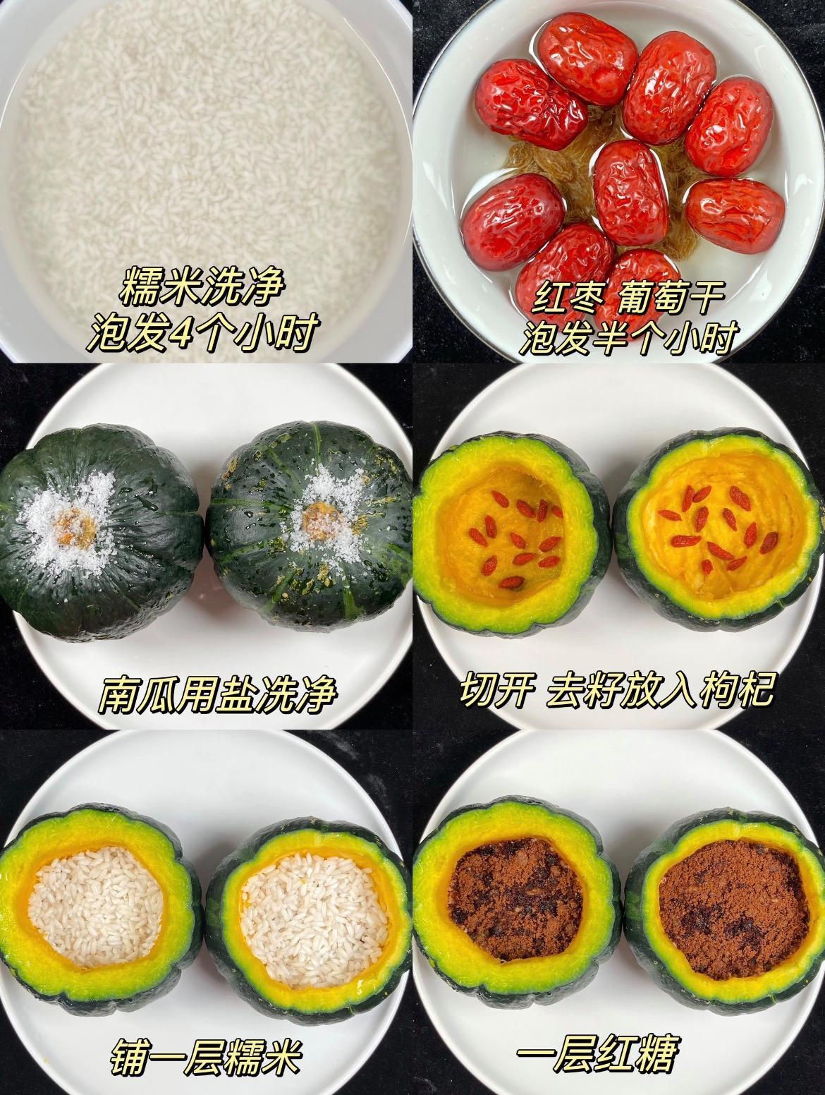貝貝南瓜或老南瓜:1個、糯米:約100克(需提前浸泡)、紅棗:6-8顆、葡萄干:1小把、枸杞:1小撮、紅糖:約30-40克(可根據喜好增減)