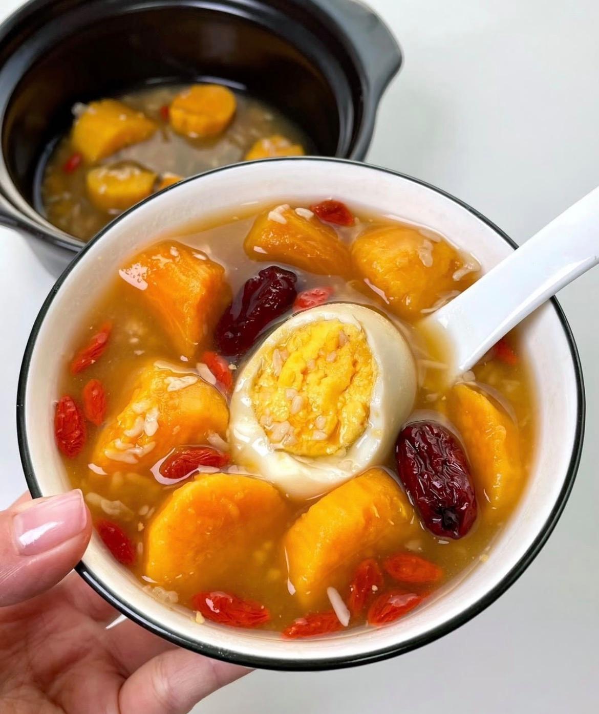 3、將剝好的水煮蛋放入紅薯湯中,倒入酒釀,輕輕攪勻,再次煮開。關火前撒入枸杞,利用余溫燜一下即可。
