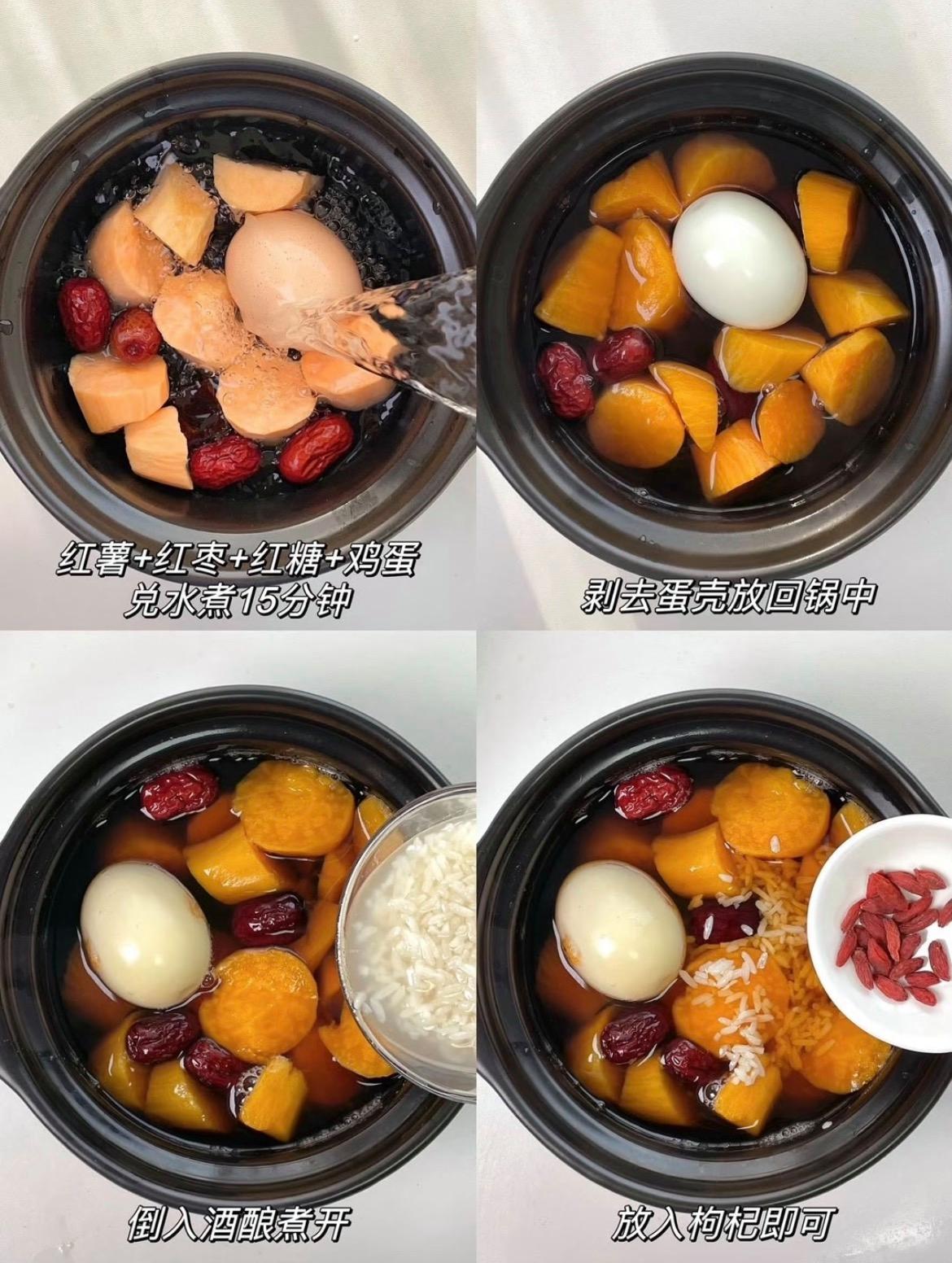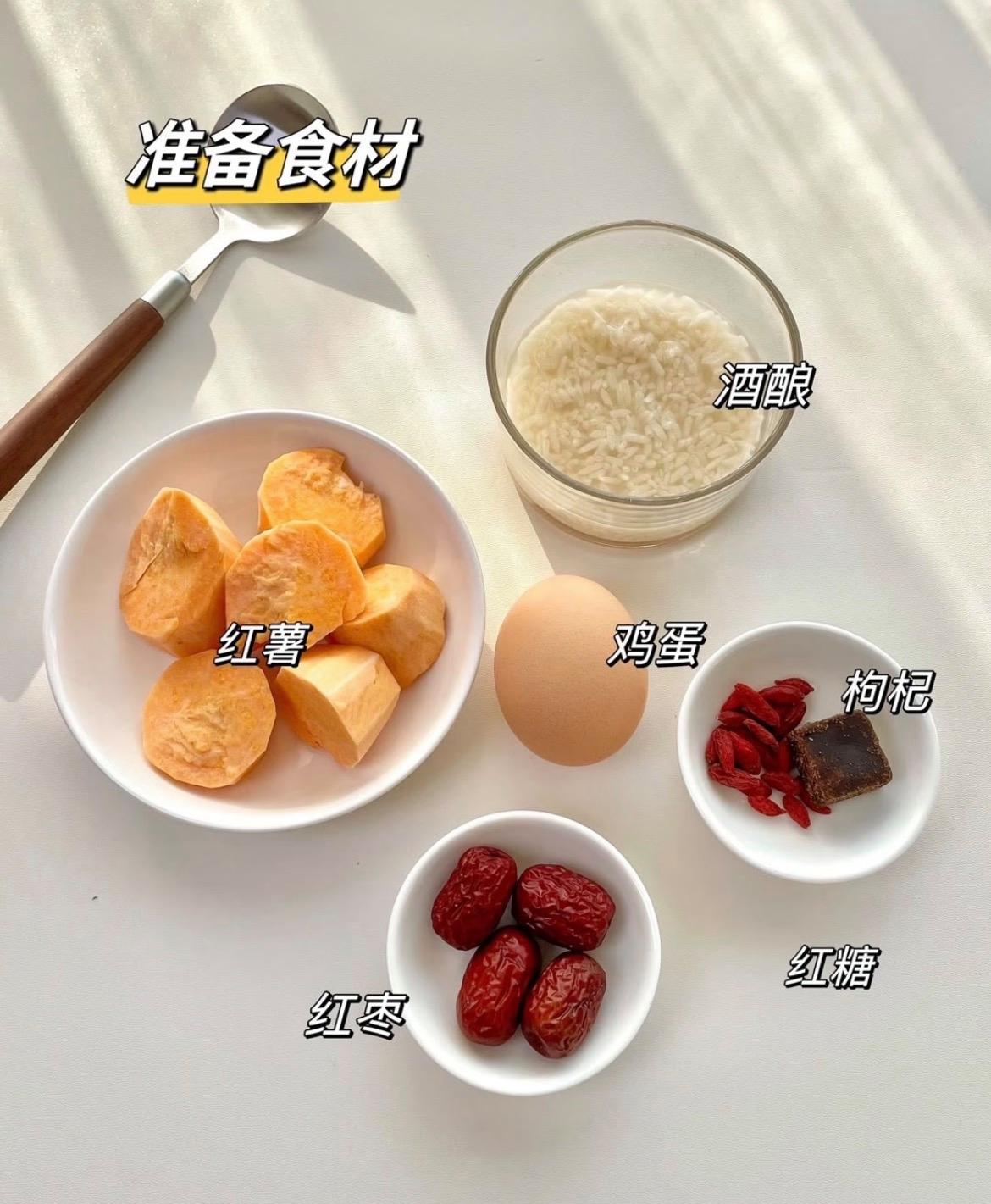 紅薯:1小個、紅棗:5-6顆(去核)、雞蛋:1個、酒釀:3-4大勺、紅糖:15-20克(可根據口味調整)、枸杞:1小把、清水:約500ml