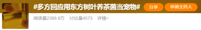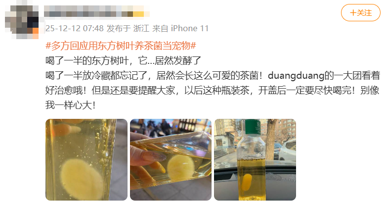 據經視直播報道,不少網友在社交媒體發帖稱,某茶葉飲料開瓶后一段時間未飲用,內部可能會出現白色球形菌團,有人將其稱為“茶菌”,專門進行培育作為寵物。
