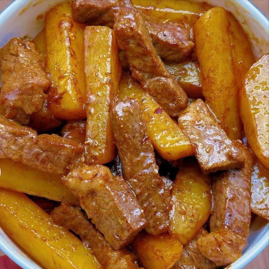 土豆富含鉀元素和膳食纖維,能輔助調節血壓、保護心血管,位居長壽食物第二位。搭配牛排做成煎鍋,肉質鮮嫩、土豆軟糯,營養均衡又下飯,一口下去超滿足。