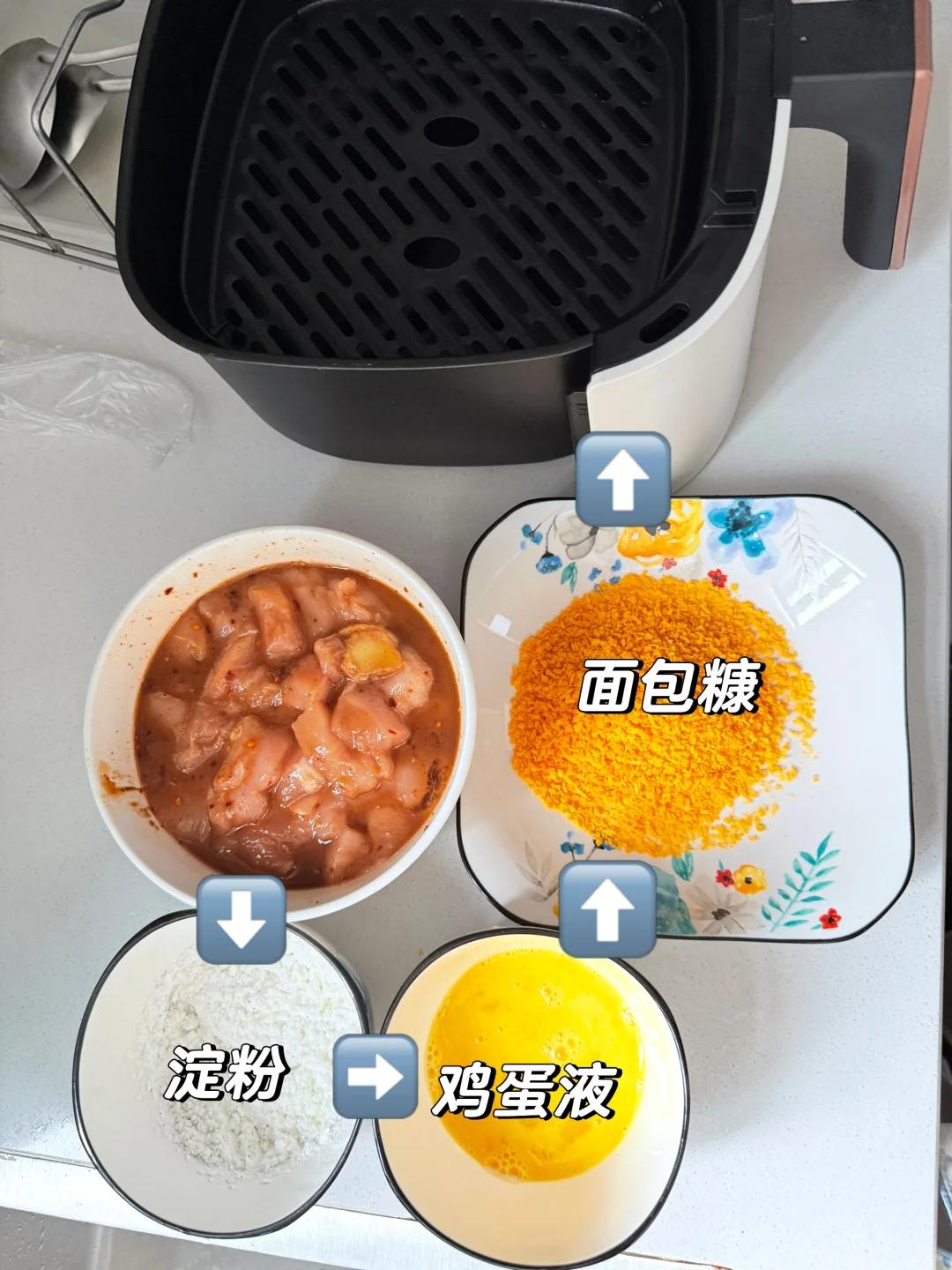 選雞胸肉,切成1厘米見方的小丁,加一勺生抽、半勺料酒、少許鹽和黑胡椒,抓勻腌十分鐘。準(zhǔn)備三個(gè)碗,分別裝面粉、打散的雞蛋液和面包糠。