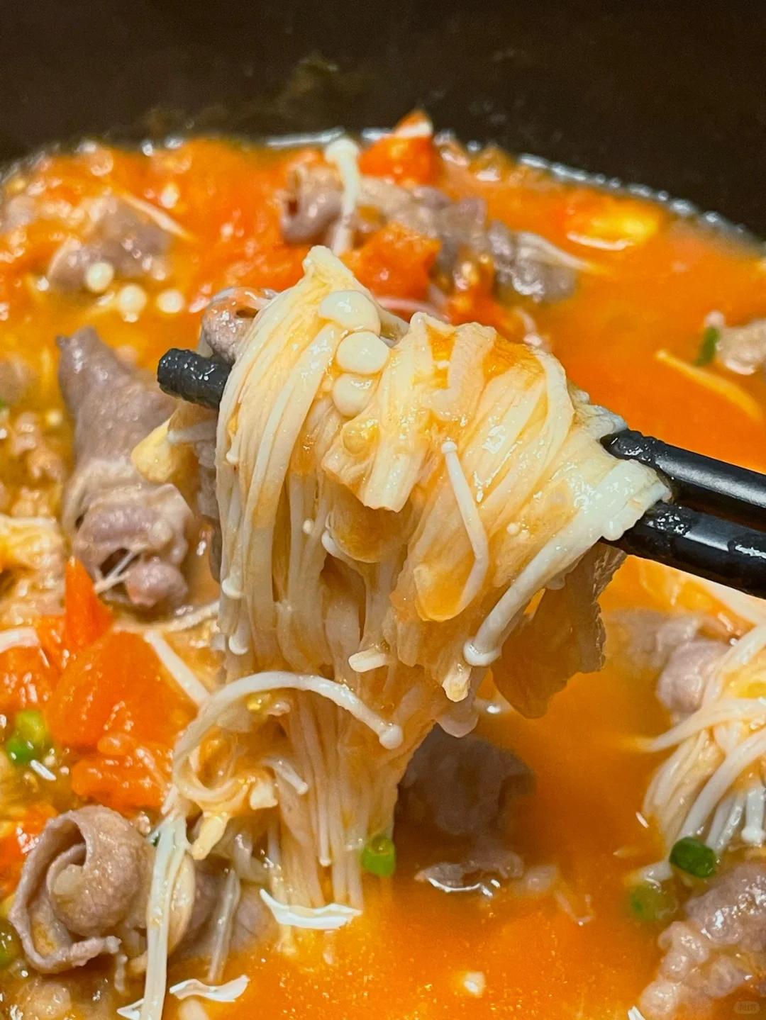 鍋里放少許油,下番茄塊翻炒,用鏟子壓碎,炒出濃稠的番茄汁,加一碗熱水燒開,放入金針菇,中小火煮三分鐘,讓金針菇吸飽番茄汁。