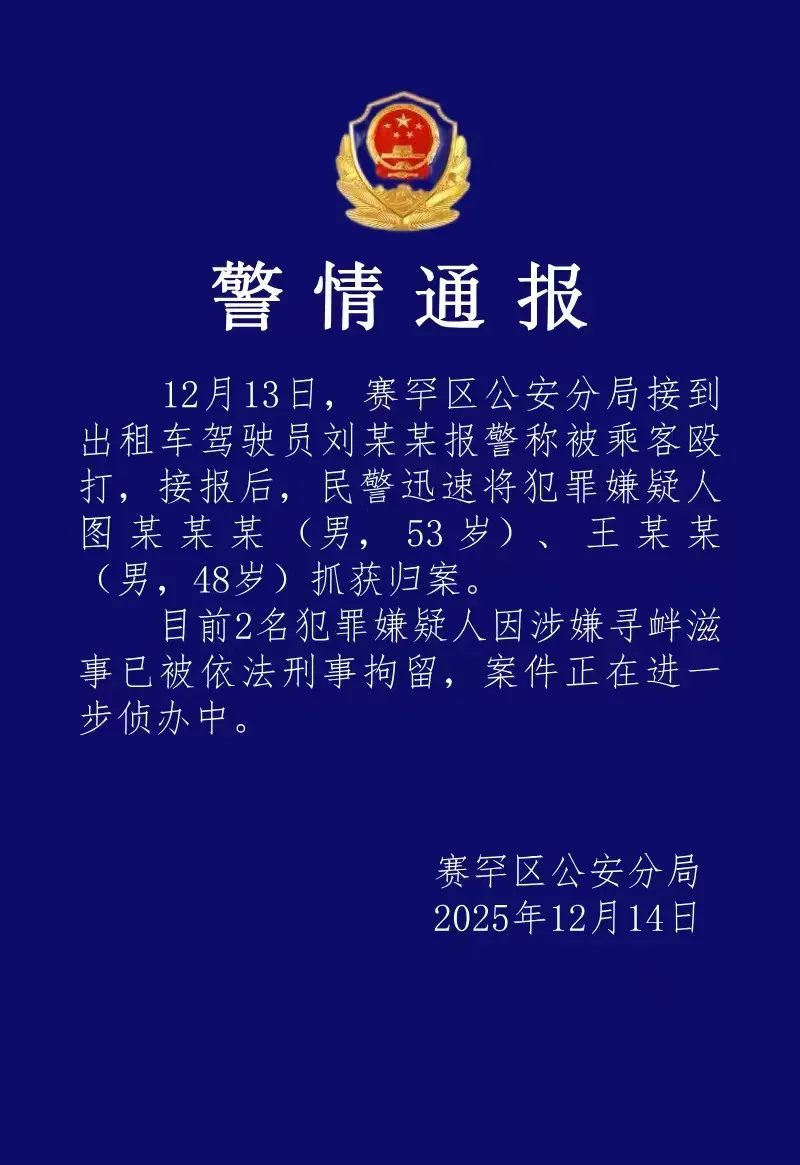 央視網消息:據“平安賽罕”微信公眾號消息,12月14日,內蒙古呼和浩特賽罕區公安分局發布警情通報:12月13日,賽罕區公安分局接到出租車駕駛員劉某某報警稱被乘客毆打,接報后,民警迅速將犯罪嫌疑人圖某某某(男,53歲)、王某某(男,48歲)抓獲歸案。目前2名犯罪嫌疑人因涉嫌尋釁滋事已被依法刑事拘留,案件正在進一步偵辦中。