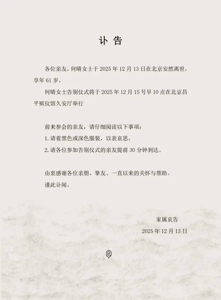 12月13日,一份家屬發布訃告顯示,著名演員何晴在北京安然離世,享年61歲。告別儀式將于2025年12月15號早10點在北京昌平殯儀館久安廳舉行。