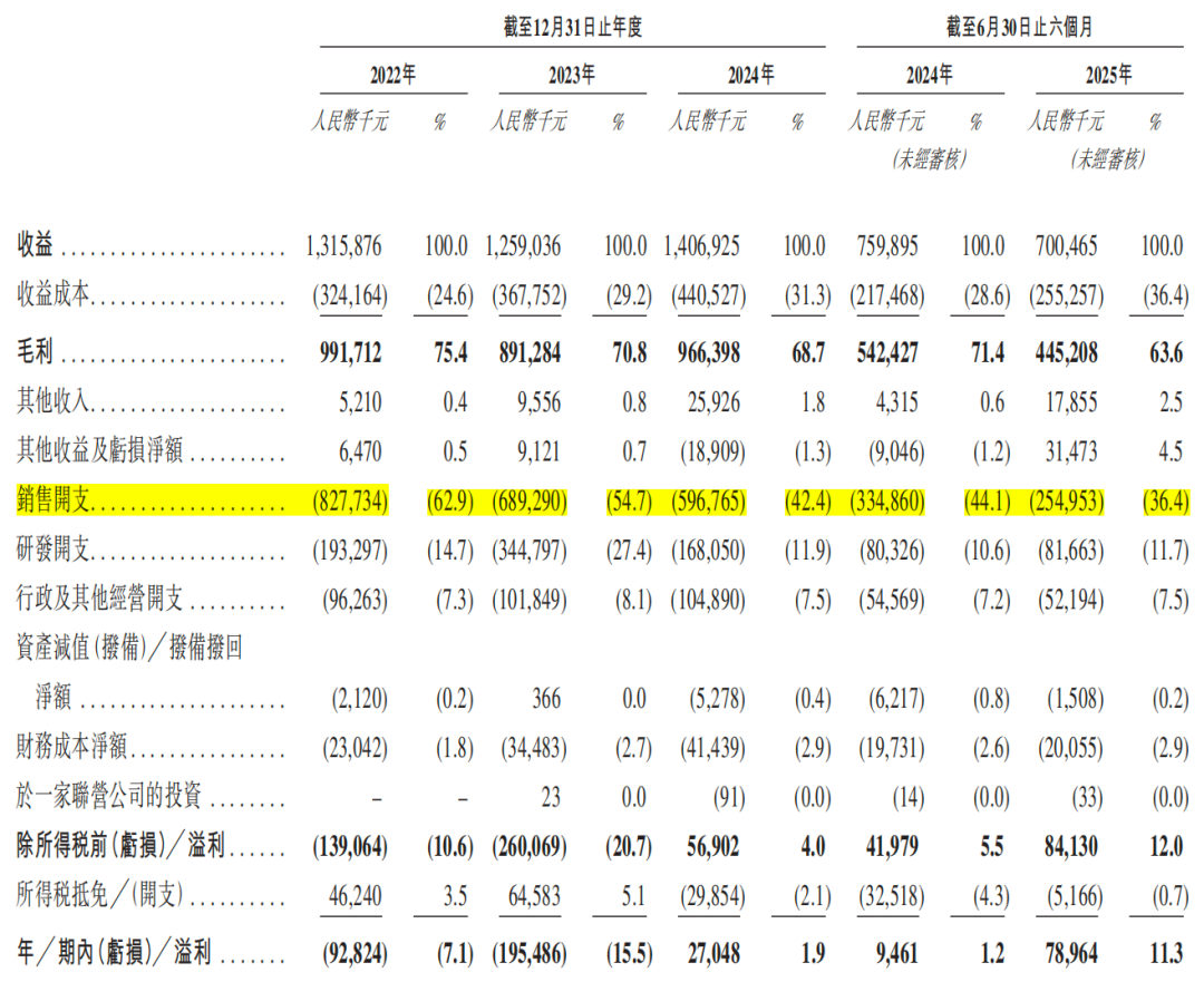 2022年-2024年及2025年上半年,科興制藥收益分別為13.16億元、12.59億元、14.07億元、7億元;期內利潤分別為-9282.4萬元、-1.95億元、2704.8萬元、7896.4萬元;毛利率分別為75.4%、70.8%、68.7%、63.6%。