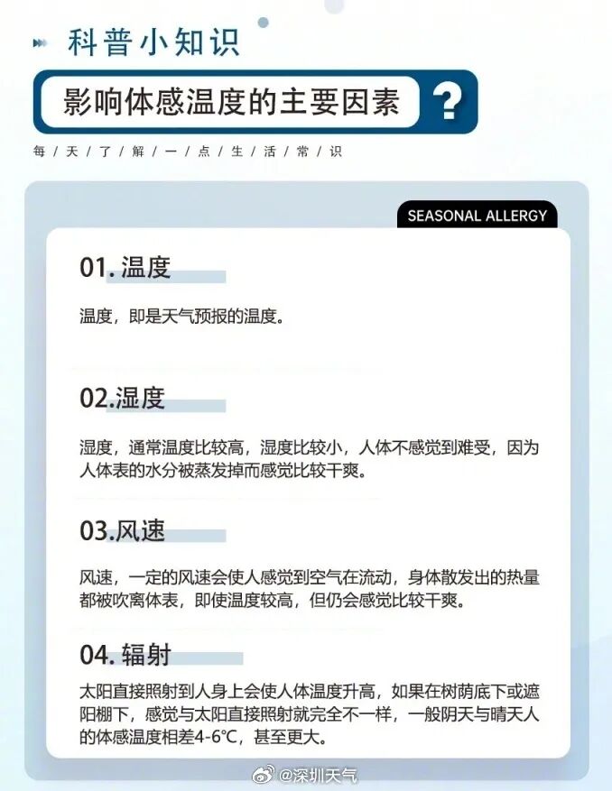 體感溫度是指人體感受空氣的溫度,其受風速、濕度、日照、個體差異等因素的影響,并且當風速越大,人體越容易散失熱量!