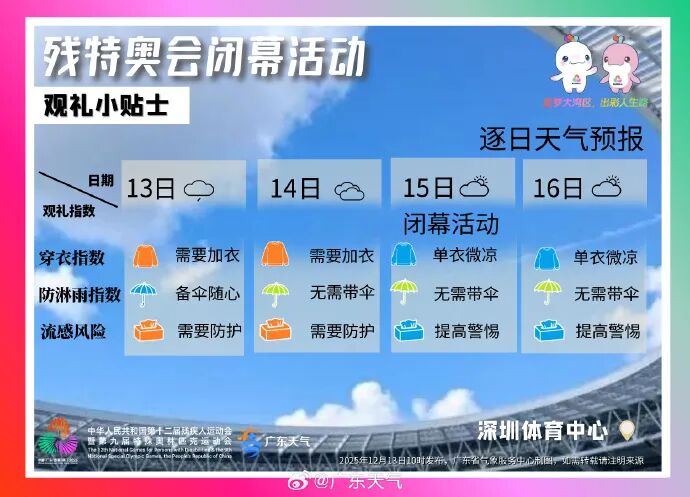 第十二屆殘疾人運動會暨第九屆特殊奧林匹克運動會閉幕活動將于2025年12月15日晚間在深圳體育中心舉行。預計15日閉幕活動當天,早晚體感較冷,最低氣溫12℃左右,計劃到現場見證的朋友們,需注意增添衣物!