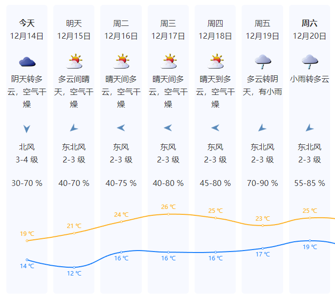 14日白天漸轉多云,風力逐漸減弱,氣溫14-19℃,天氣漸轉干燥;