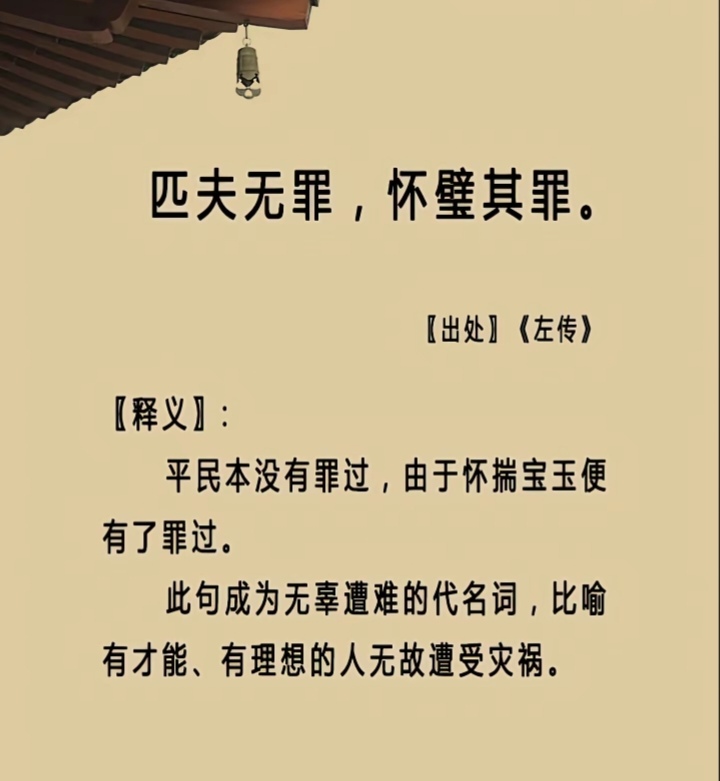 - 出處:出自《左傳·桓公十年》,原文為“匹夫無罪,懷璧其罪”。