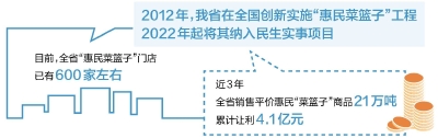 2012年,安徽省在全國創新實施“惠民菜籃子”工程,2022年起將其納入民生實事項目。目前全省“惠民菜籃子”門店已有600家左右,在各市城區主要社區基本實現“全覆蓋”。近3年全省銷售平價惠民“菜籃子”商品21萬噸,累計讓利達4.1億元。在主要節假日、突發事件及菜價上漲時,“惠民菜籃子”總會如約而至,為群眾帶來“穩穩的幸福”。