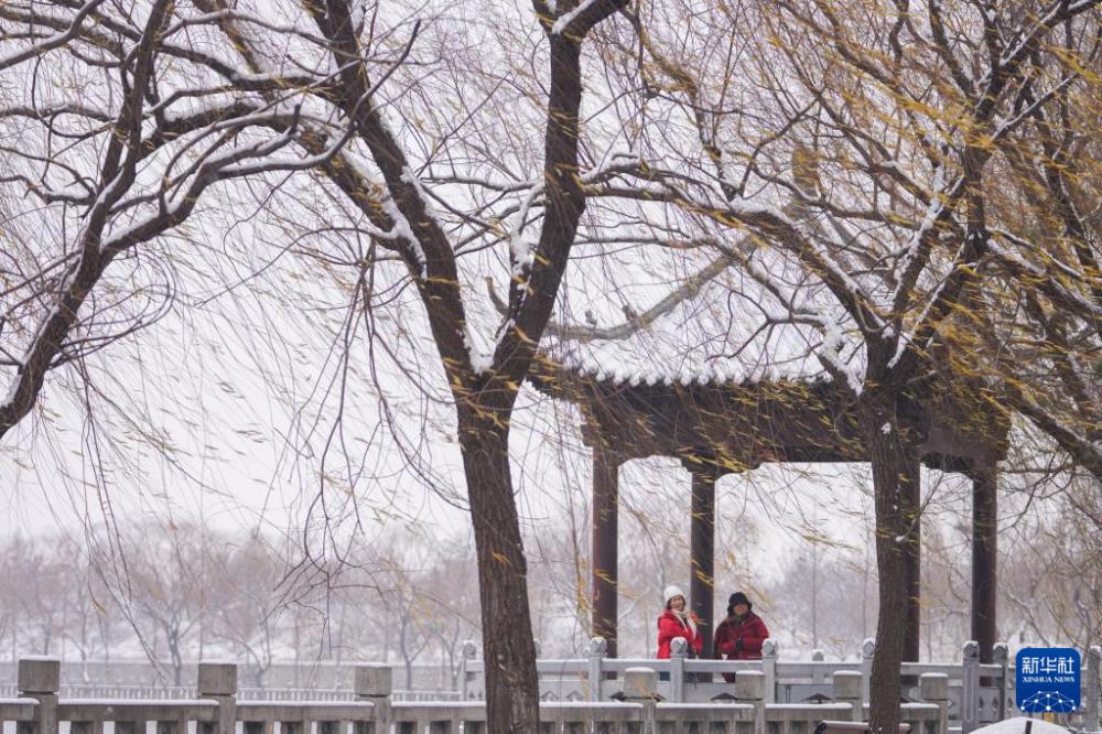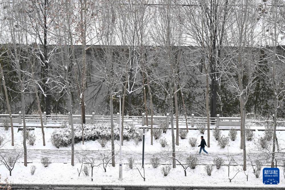 12月13日,市民在河北省石家莊市新華區(qū)一處公園的雪地里行走。