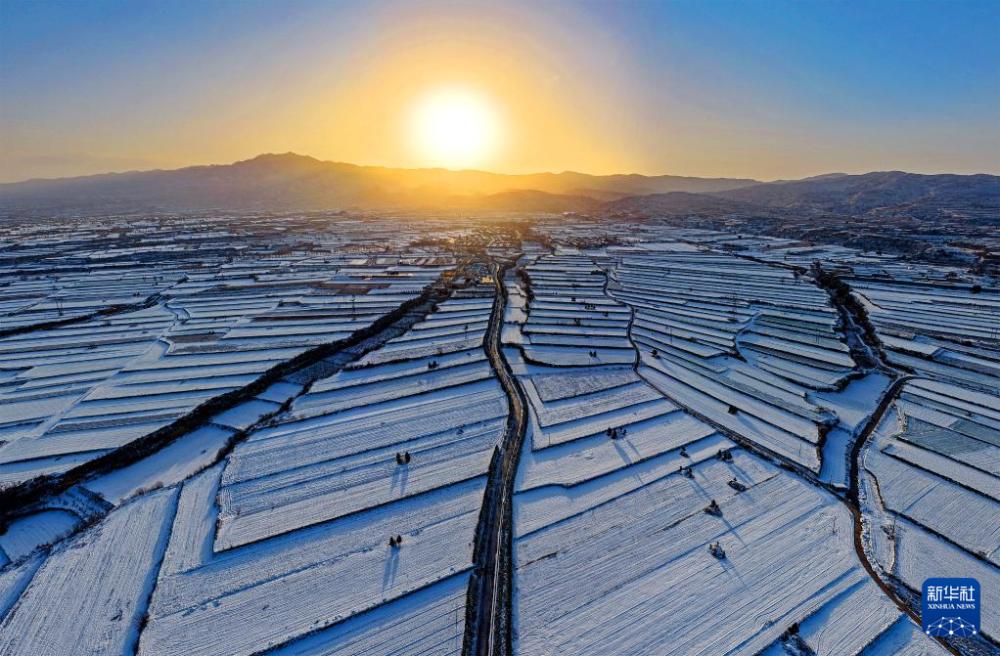 12月13日在山西省臨汾市襄汾縣陶寺鄉(xiāng)中梁村附近拍攝的梯田雪景(無(wú)人機(jī)照片)。
