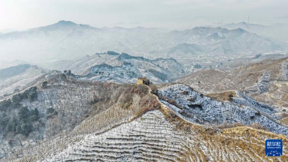 12月13日在河北省遵化市拍攝的古長(zhǎng)城雪景(無(wú)人機(jī)照片)。