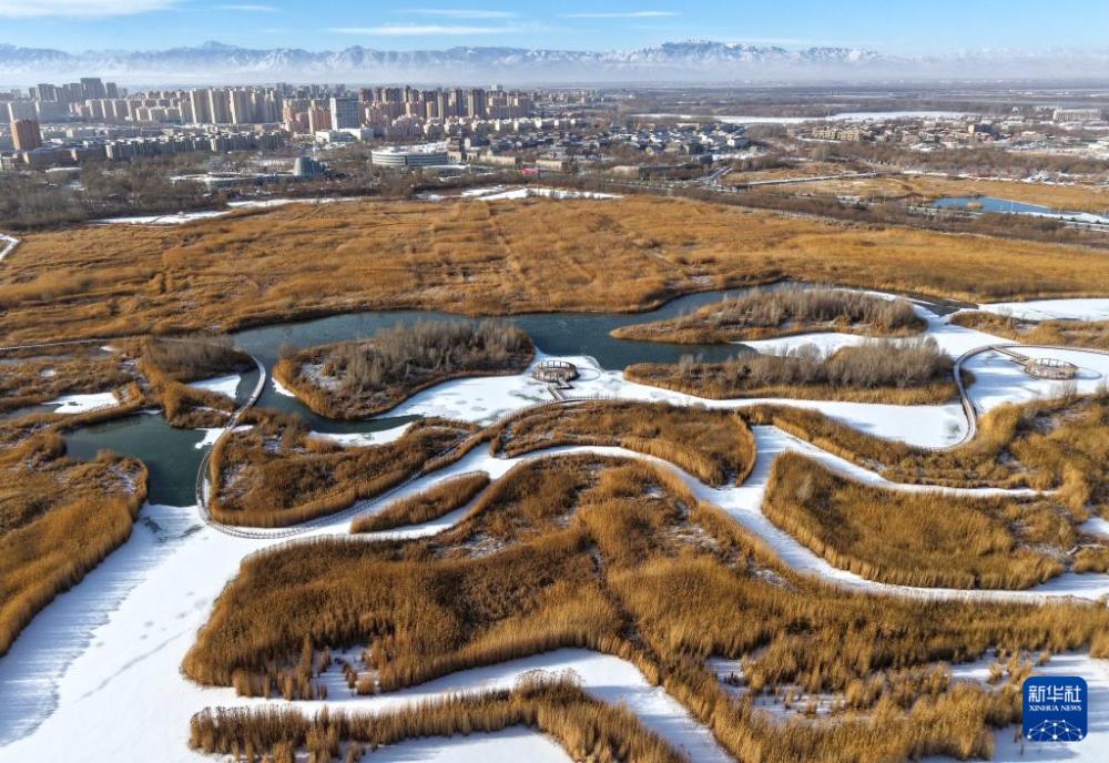 12月13日在甘肅張掖國(guó)家濕地公園拍攝的雪后景色。