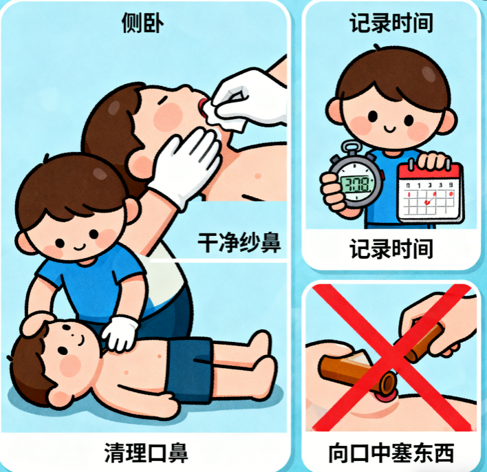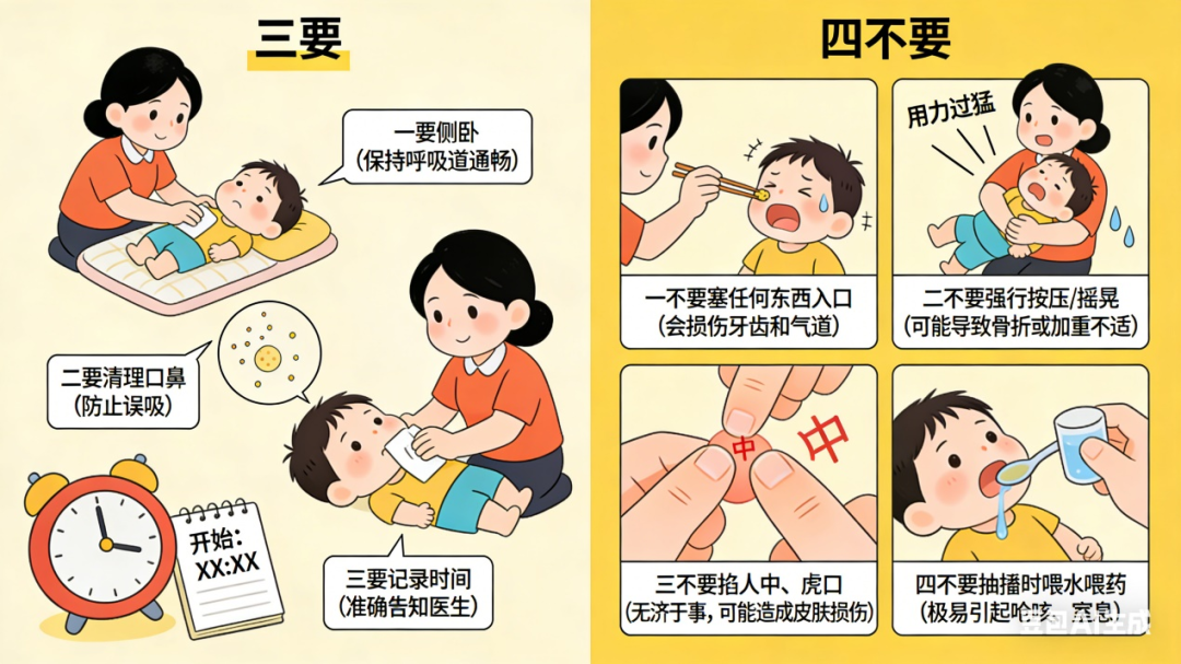 四不要:不要向口中塞任何東西;不要強行按壓或搖晃孩子;不要掐人中、虎口;不要在抽搐時喂藥或喂水。