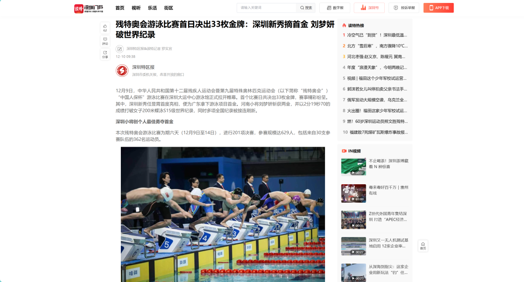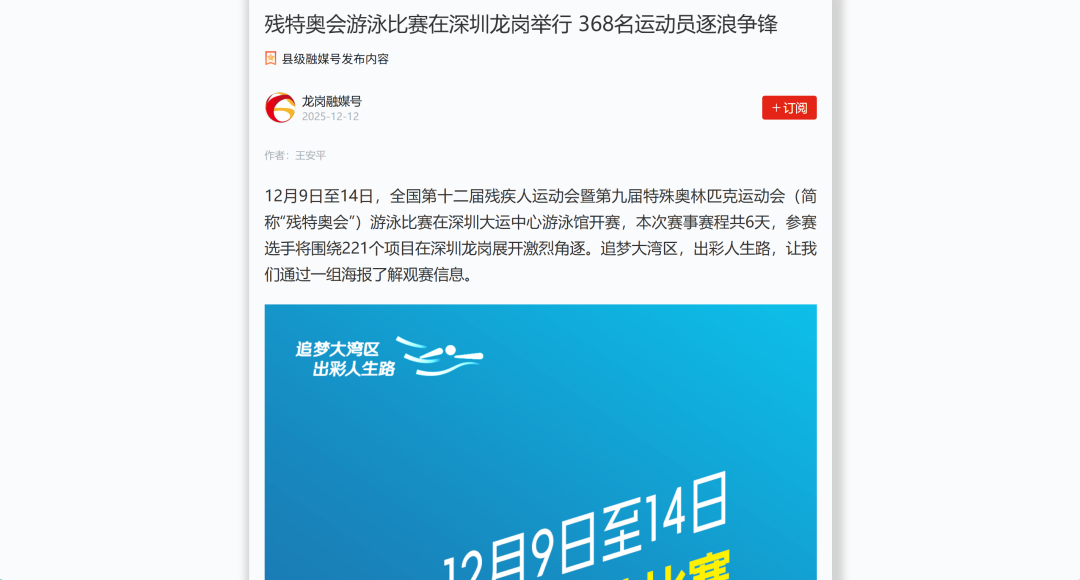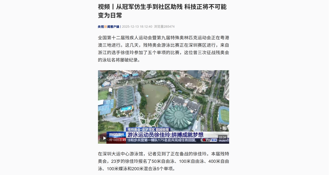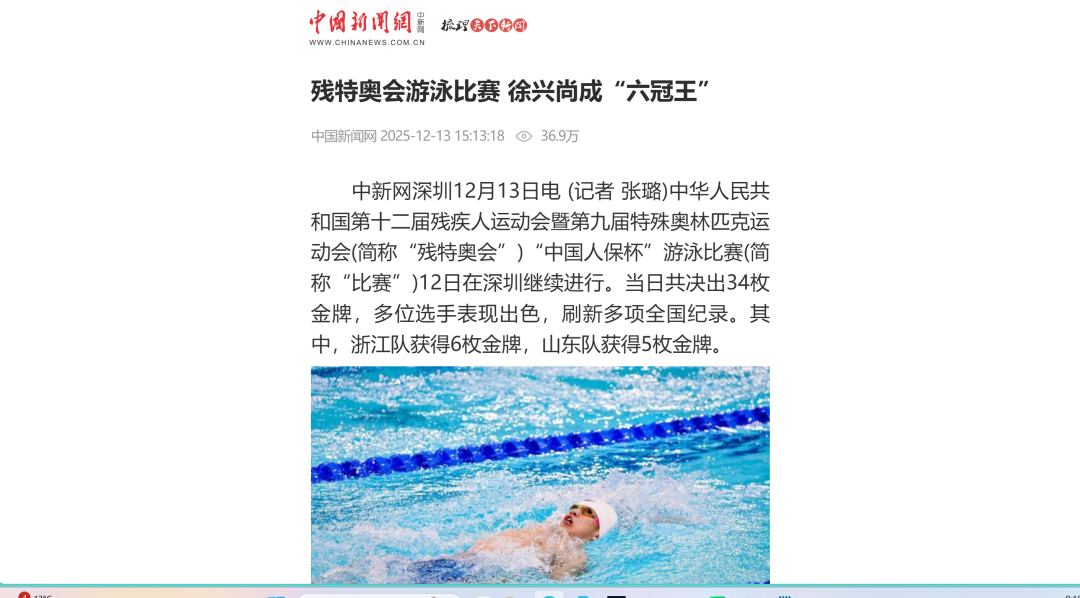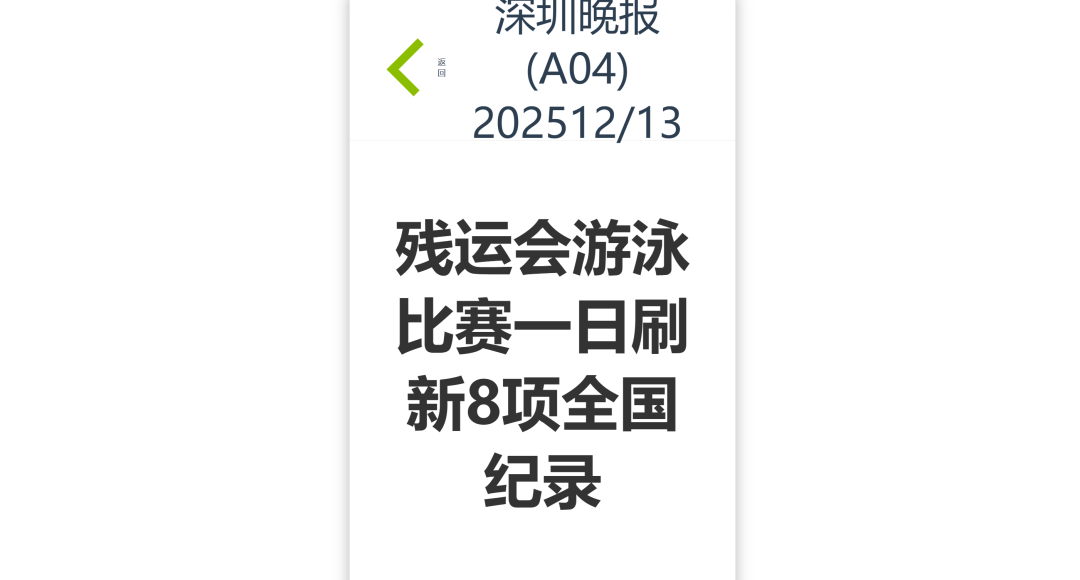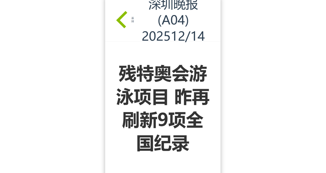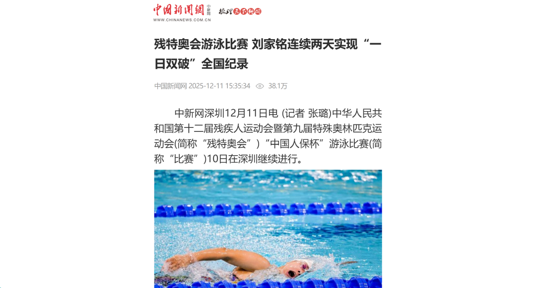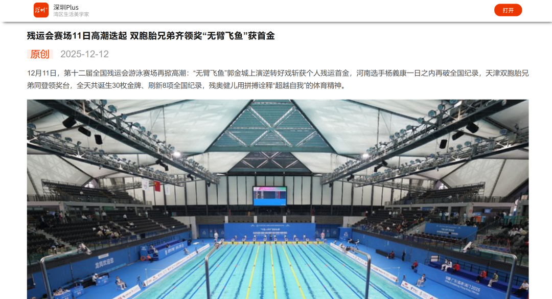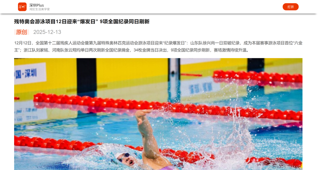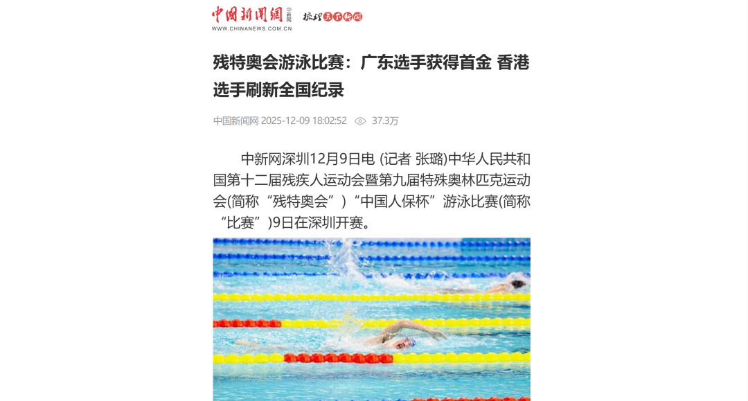 12月9日—12月14日,中華人民共和國第十二屆殘疾人運動會暨第九屆特殊奧林匹克運動會(簡稱“殘?zhí)貖W會”)“中國人保杯”游泳比賽在深圳大運中心舉行。在男子50米自由泳S1/S2決賽中,廣東一團(tuán)任昱霄發(fā)揮出色,以1分09秒47的成績獲得金牌,這也是本屆殘?zhí)貖W會游泳比賽的首枚金牌。作為本屆殘?zhí)貖W會的重要賽事,游泳比賽設(shè)置了多個殘疾類別和運動級別,涵蓋自由泳、蛙泳、仰泳、蝶泳等多個項目,充分體現(xiàn)了“公平競技、全面參與”的賽事理念。賽場上運動員奮力拼搏,賽場外溫暖與感動交織。志愿者全程提供細(xì)致服務(wù),從運動員引導(dǎo)、器材保障到無障礙設(shè)施維護(hù),用專業(yè)與耐心為賽事保駕護(hù)航。