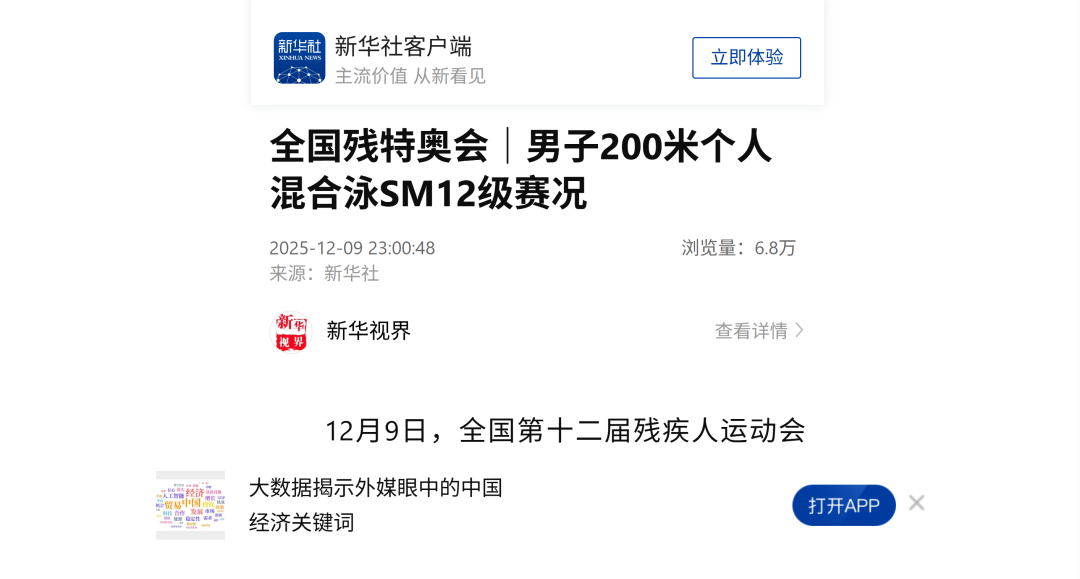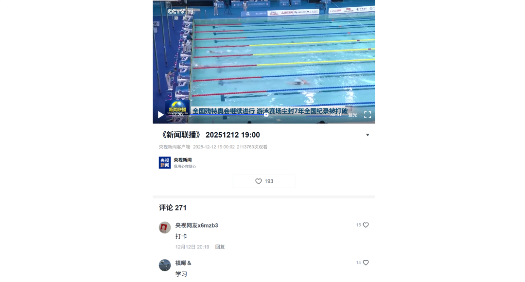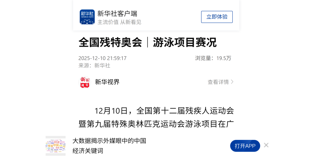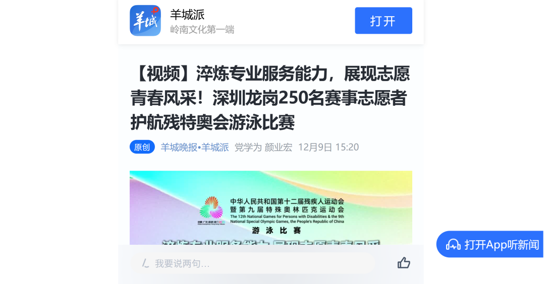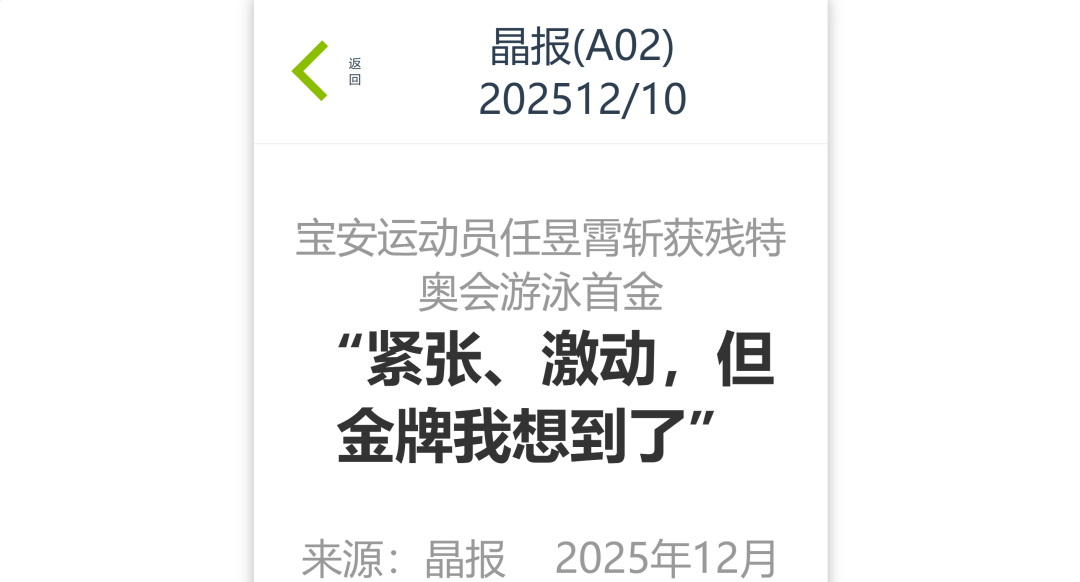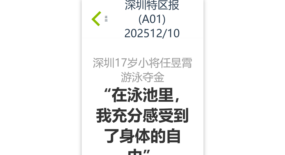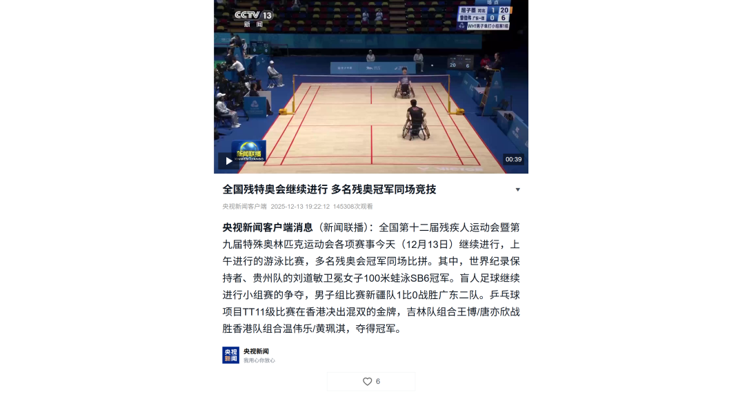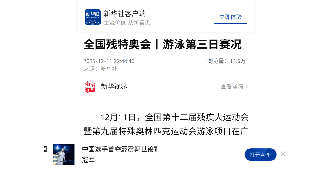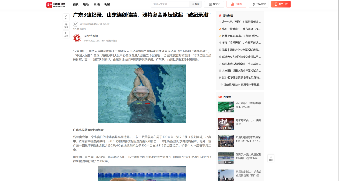 12月9日—12月14日,中華人民共和國第十二屆殘疾人運動會暨第九屆特殊奧林匹克運動會(簡稱“殘?zhí)貖W會”)“中國人保杯”游泳比賽在深圳大運中心舉行。在男子50米自由泳S1/S2決賽中,廣東一團(tuán)任昱霄發(fā)揮出色,以1分09秒47的成績獲得金牌,這也是本屆殘?zhí)貖W會游泳比賽的首枚金牌。作為本屆殘?zhí)貖W會的重要賽事,游泳比賽設(shè)置了多個殘疾類別和運動級別,涵蓋自由泳、蛙泳、仰泳、蝶泳等多個項目,充分體現(xiàn)了“公平競技、全面參與”的賽事理念。賽場上運動員奮力拼搏,賽場外溫暖與感動交織。志愿者全程提供細(xì)致服務(wù),從運動員引導(dǎo)、器材保障到無障礙設(shè)施維護(hù),用專業(yè)與耐心為賽事保駕護(hù)航。