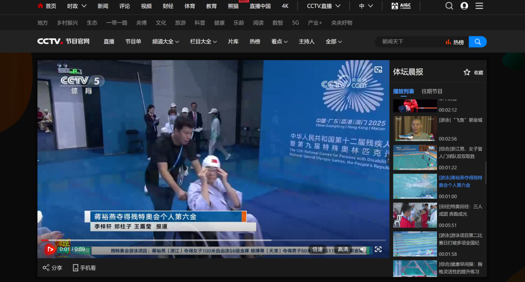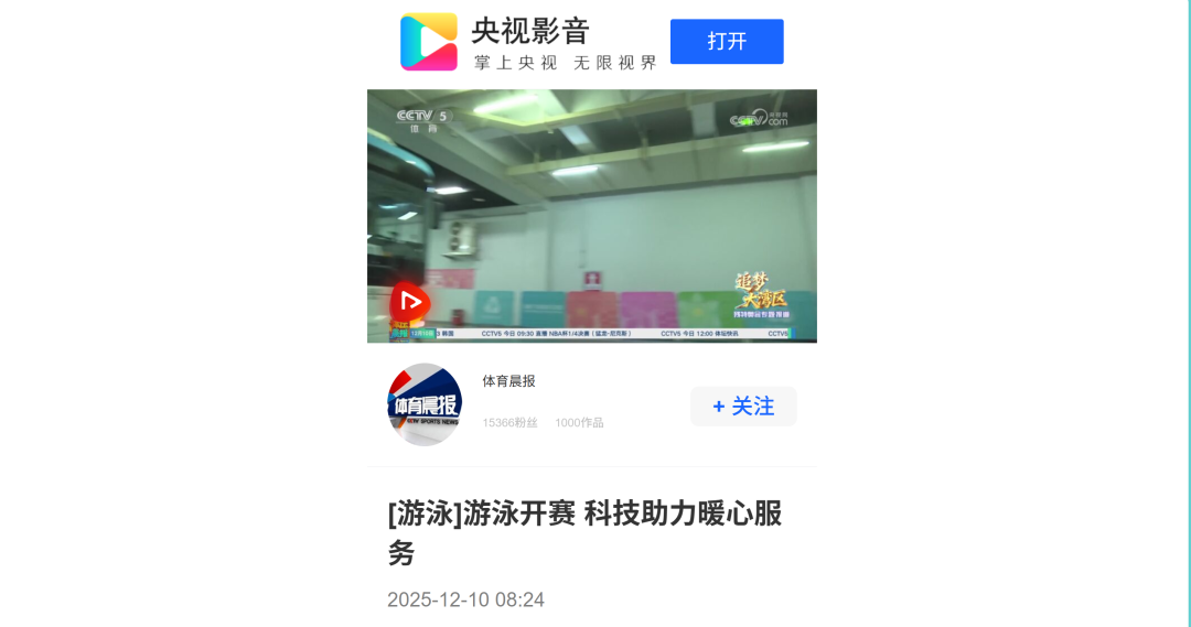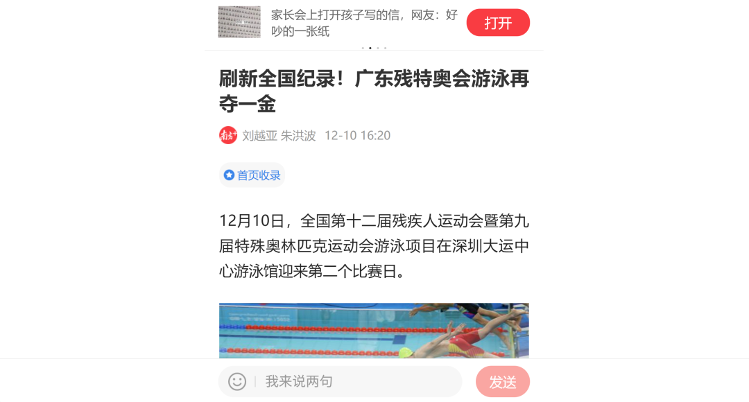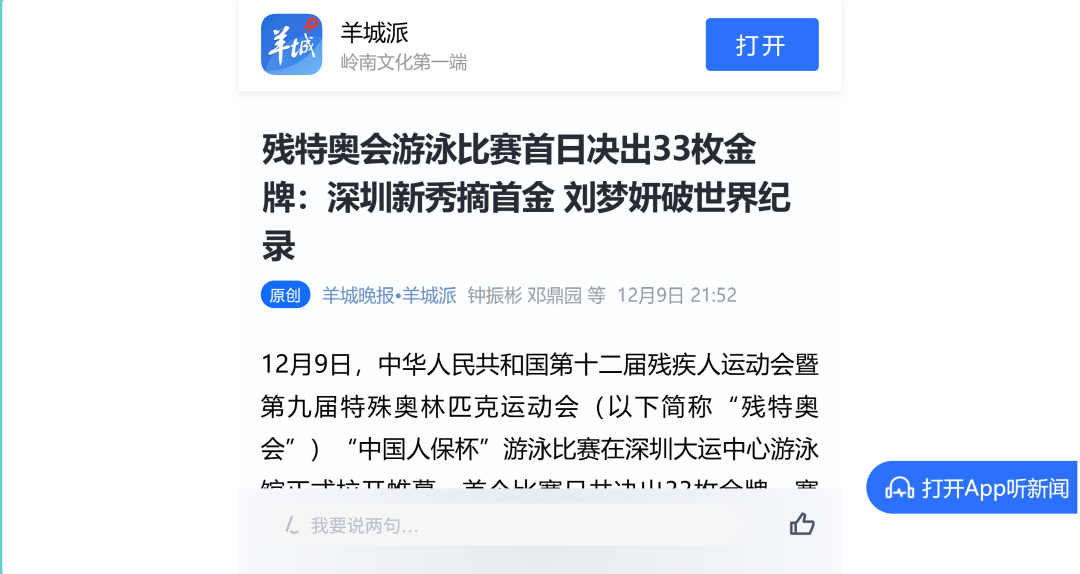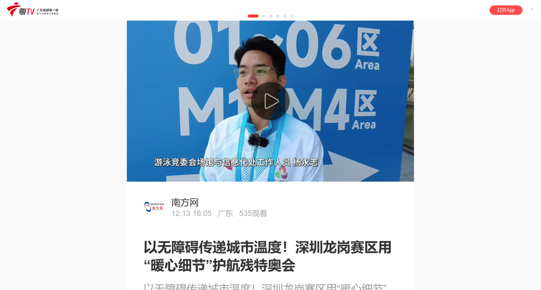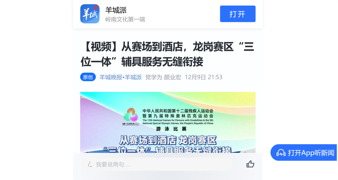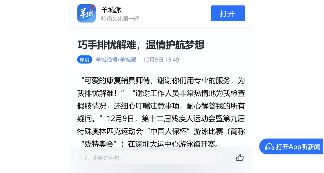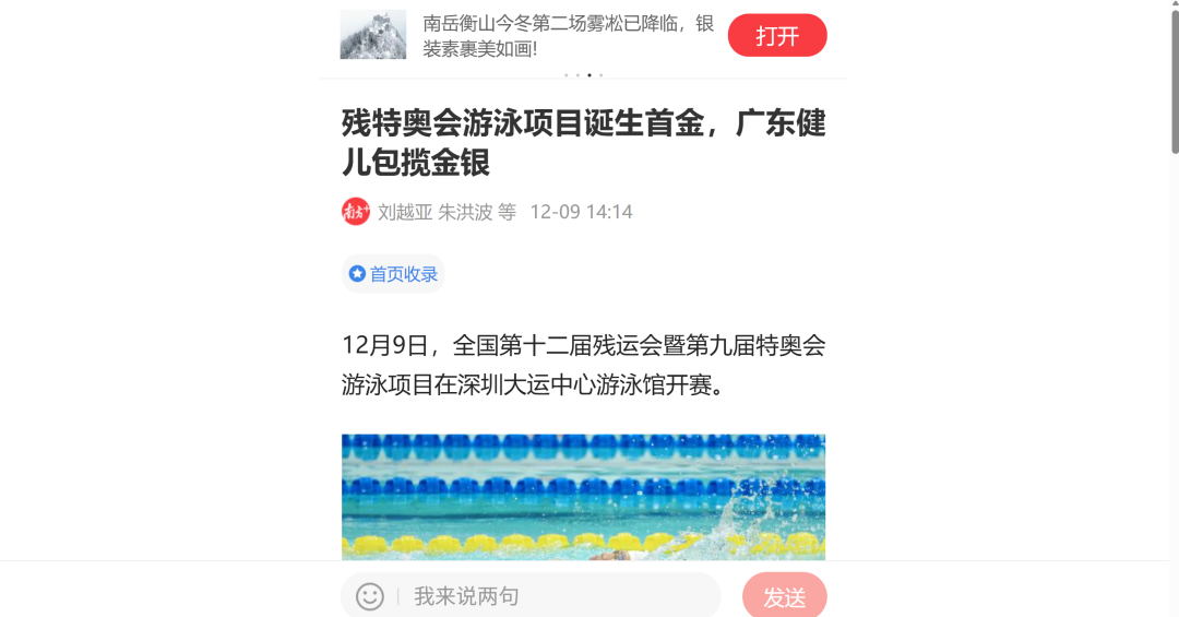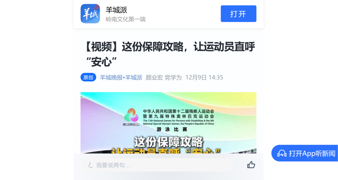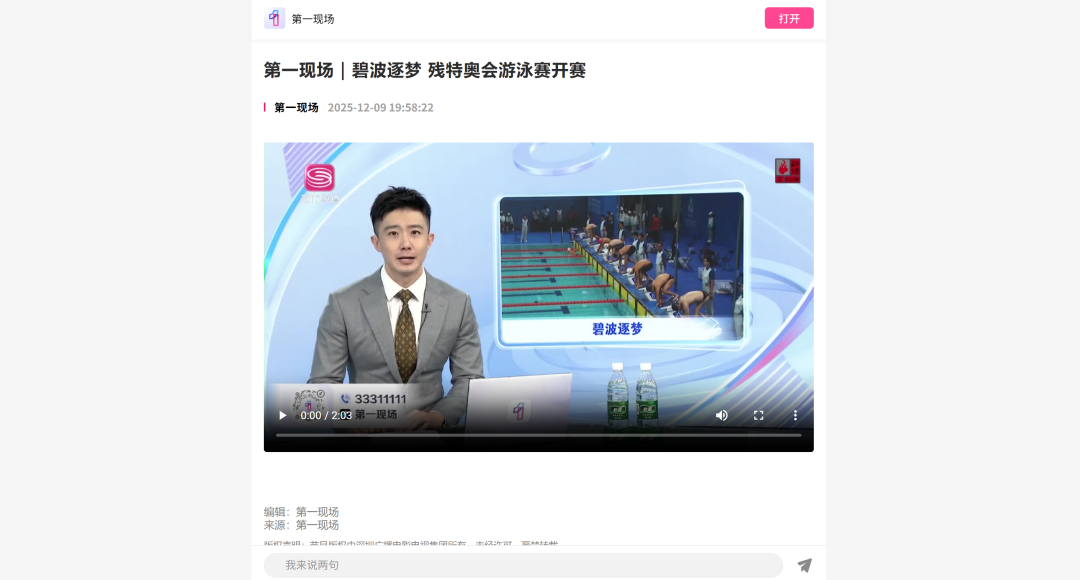 12月9日—12月14日,中華人民共和國第十二屆殘疾人運動會暨第九屆特殊奧林匹克運動會(簡稱“殘?zhí)貖W會”)“中國人保杯”游泳比賽在深圳大運中心舉行。在男子50米自由泳S1/S2決賽中,廣東一團(tuán)任昱霄發(fā)揮出色,以1分09秒47的成績獲得金牌,這也是本屆殘?zhí)貖W會游泳比賽的首枚金牌。作為本屆殘?zhí)貖W會的重要賽事,游泳比賽設(shè)置了多個殘疾類別和運動級別,涵蓋自由泳、蛙泳、仰泳、蝶泳等多個項目,充分體現(xiàn)了“公平競技、全面參與”的賽事理念。賽場上運動員奮力拼搏,賽場外溫暖與感動交織。志愿者全程提供細(xì)致服務(wù),從運動員引導(dǎo)、器材保障到無障礙設(shè)施維護(hù),用專業(yè)與耐心為賽事保駕護(hù)航。