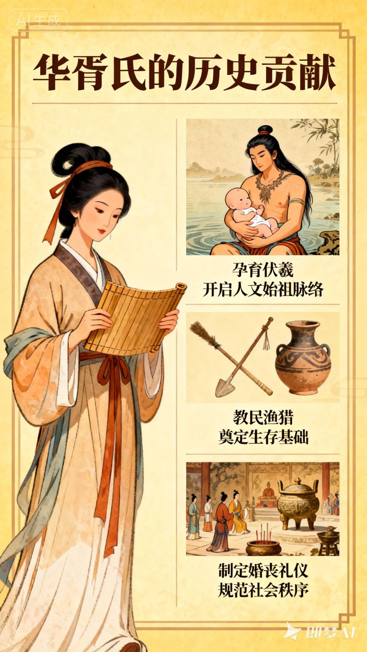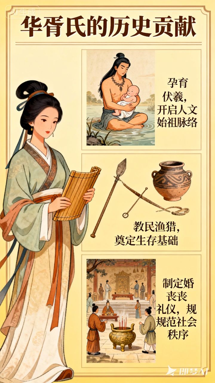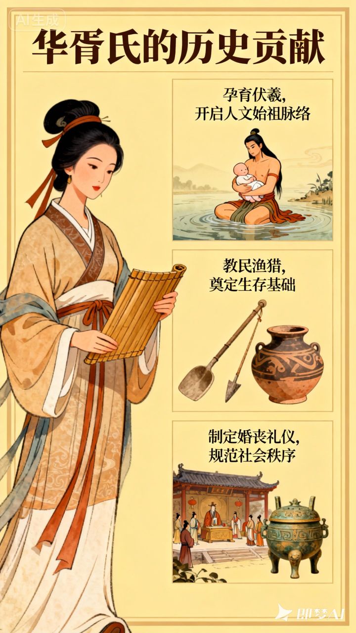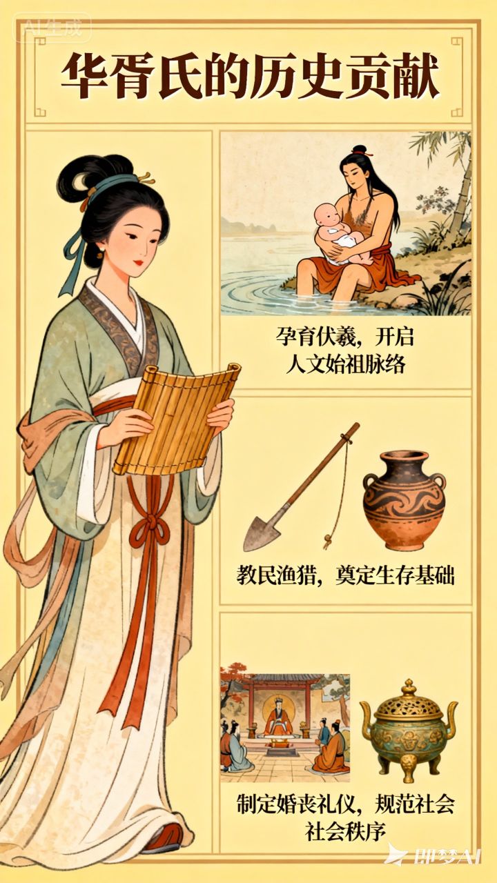 華胥氏是中國上古時期母系氏族社會杰出的部落女首領,傳說她是女媧、伏羲的母親,炎帝和黃帝的直系遠祖,被尊為中華民族的始祖母。這一傳說構建了中華民族的血緣譜系,確立了華胥氏作為華夏子孫繁衍之根的地位,讓人們認識到中華文明有著共同的祖先和血脈傳承,增強了民族的認同感和歸屬感。