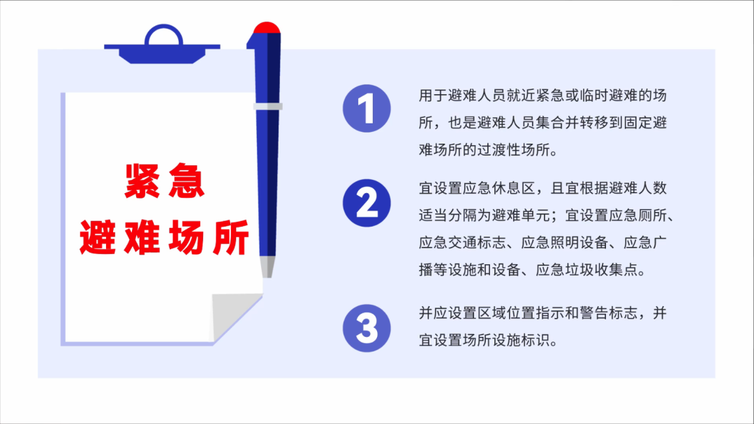 應急避難場所通常選擇符合國家設防標準的公園、廣場、體育場館和學校等平坦開闊的場地。