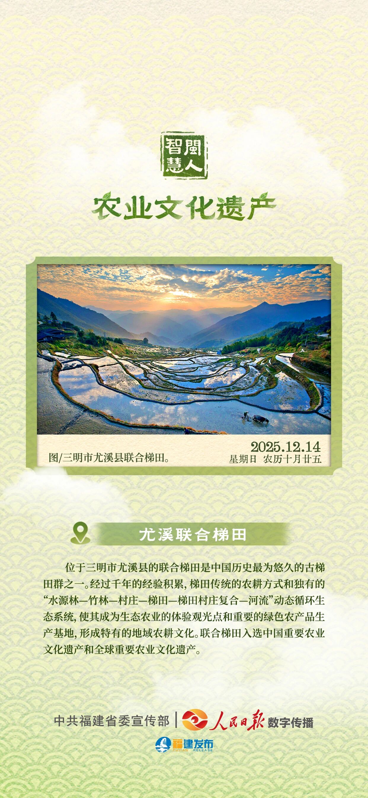 位于三明市尤溪縣的聯合梯田是中國歷史最為悠久的古梯田群之一。經過千年的經驗積累,梯田傳統的農耕方式和獨有的“水源林—竹林—村莊—梯田—梯田村莊復合—河流”動態循環生態系統,使其成為生態農業的體驗觀光點和重要的綠色農產品生產基地,形成特有的地域農耕文化。聯合梯田入選中國重要農業文化遺產和全球重要農業文化遺產。