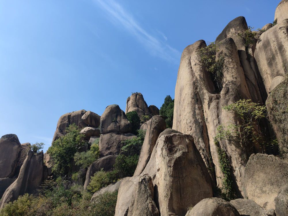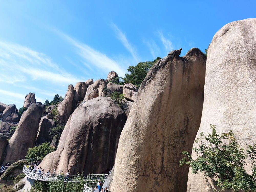 沿石階上行,腳下的花崗巖歷經億萬年風化,形成了千姿百態的象形石景觀。“雙猴望月”凝眸遠眺,“飛來石”懸于崖邊,仿佛一陣風便能吹落,大自然的鬼斧神工令人嘆服。行至黑風洞,作為《西游記》黑熊精的取景地,洞內陰涼濕潤,光影透過石縫灑落,耳畔仿佛傳來取經路上的腳步聲。穿過西游文化廣場,石猴院的“天下第一石猴”惟妙惟肖,相傳這里便是吳承恩創作“猴王出世”的靈感來源,駐足凝視,仿佛能看見石猴破壁而出的靈動模樣。