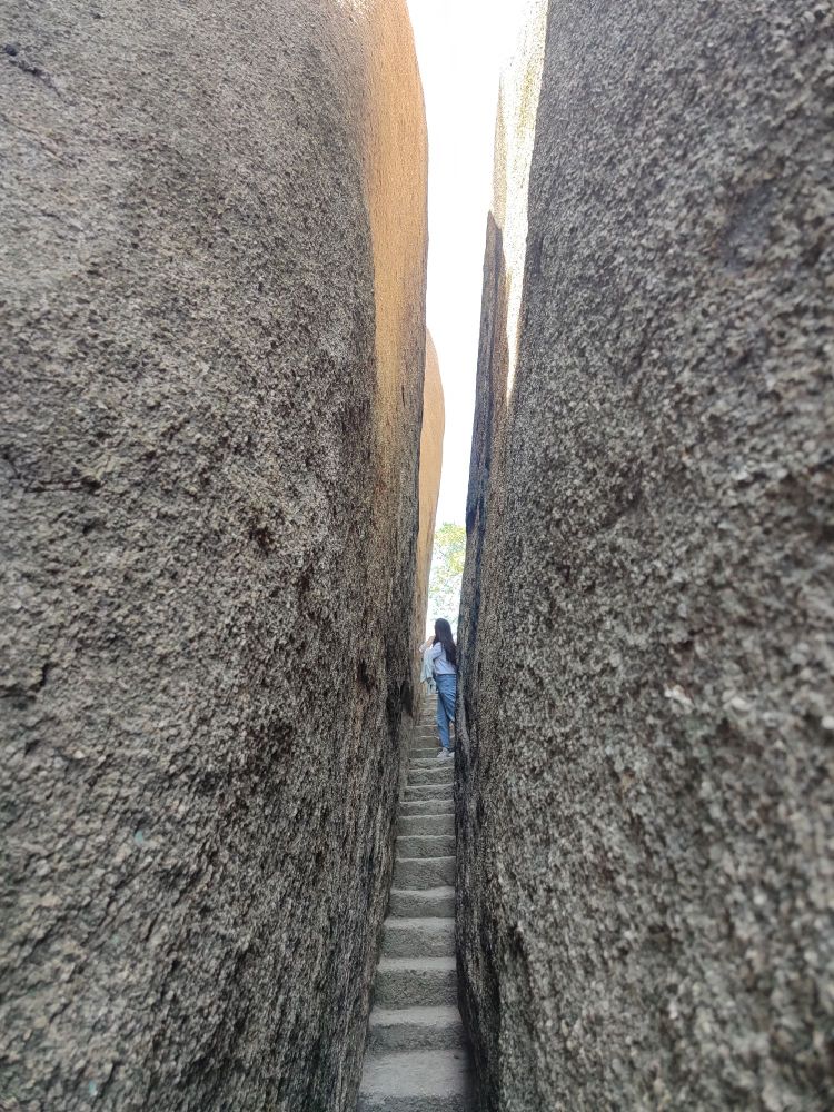 登山途中最驚險的莫過于一線天,狹窄的通道僅容一人側身通過,兩側石壁陡峭如削,仰望天空只剩細細一線光亮,石階濕滑,需緊抓鐵鏈緩緩前行。