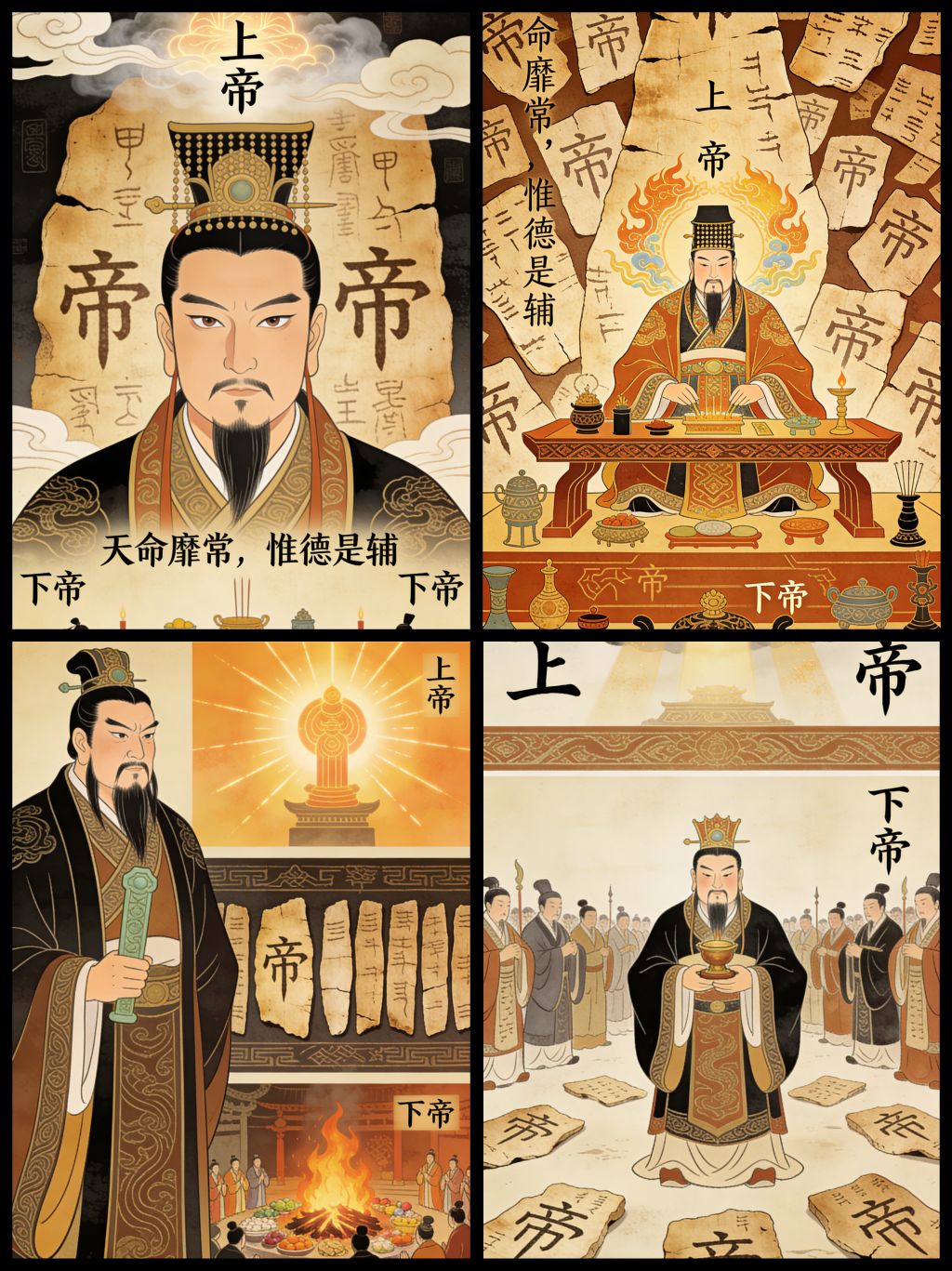 早在成湯革命之前,商族就已將祖先神“帝”視為其族群崇拜核心,這一點可從殷墟卜辭中頻繁出現的“上帝”與“下帝”祭祀中看出。甲骨文中,“上帝”往往為最高神靈,決定戰爭勝負、災異吉兇,乃一切“命”的根源;而“下帝”通常指已去世的王族祖先,如成湯、武丁等,他們在死后被升格為可與上帝溝通的中介神靈。正是在這套信仰系統中,商族逐步將祖先崇拜與天命論結合起來,構建出“由祖先得天命、由德配上帝”的政治宗教體系。