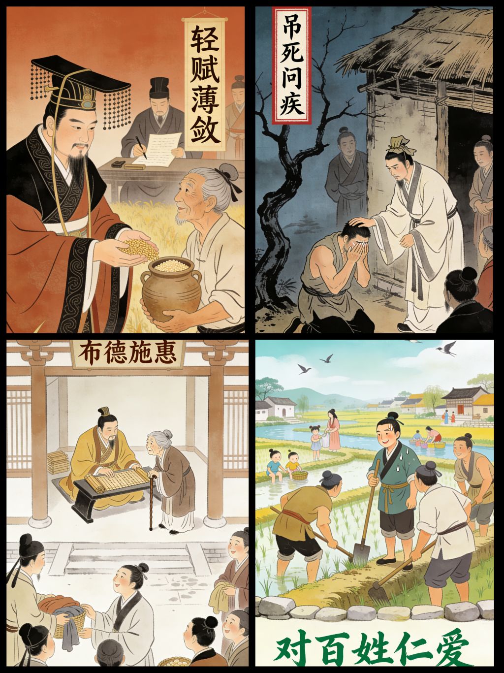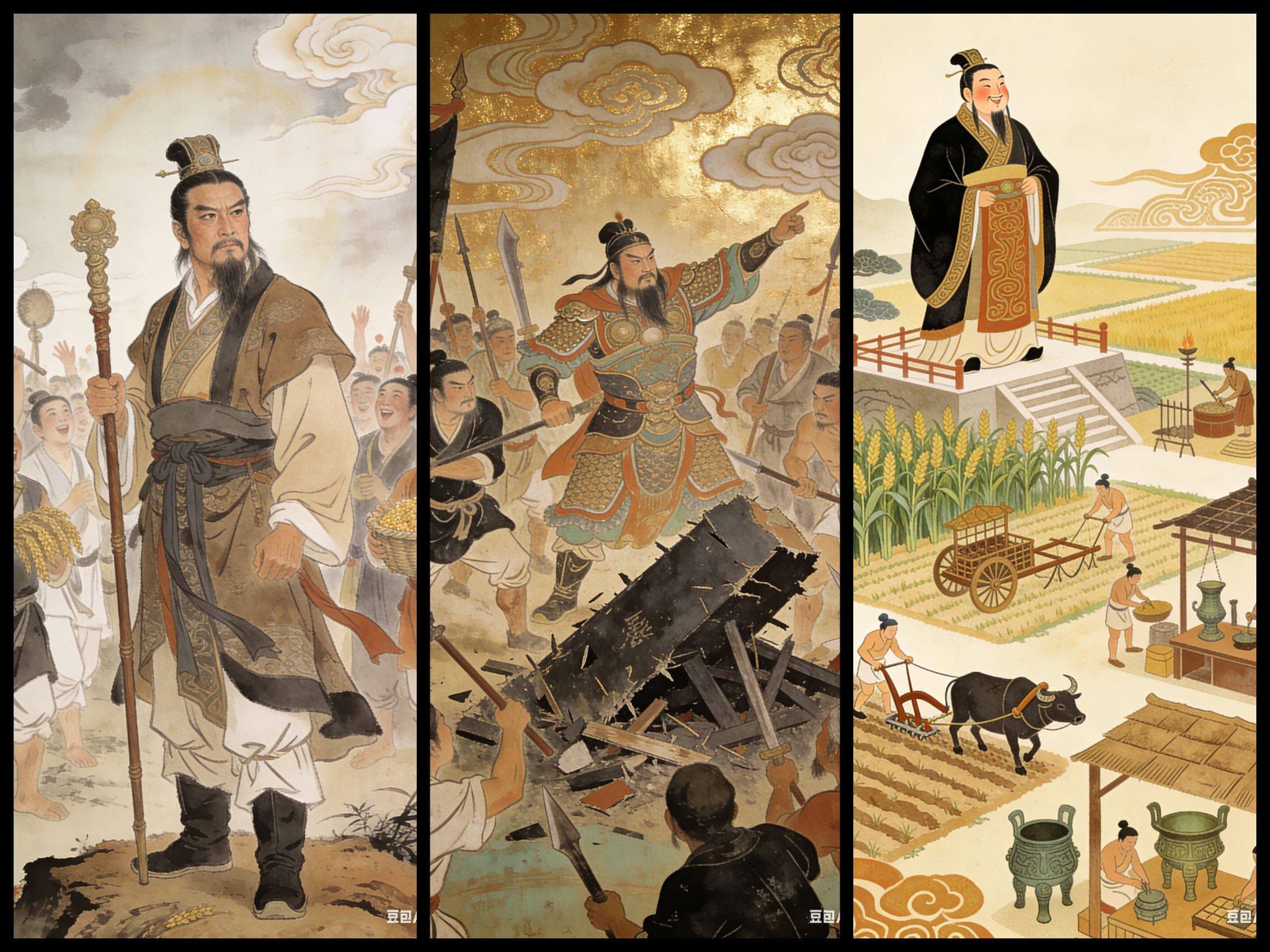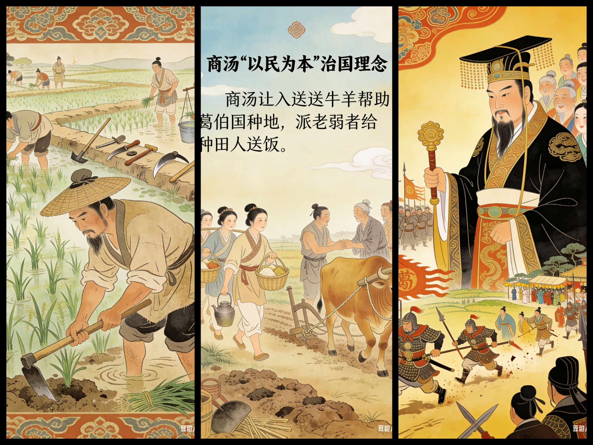 商湯的“以民為本”理念體現在他的治國實踐中。他身體力行,親自下田耕作,體驗農桑之艱辛,與底層百姓同甘共苦;同時大力推行輕徭薄賦的政策,休養生息,積極鼓勵農耕生產,使得商國的經濟迅速復蘇并走向繁榮。