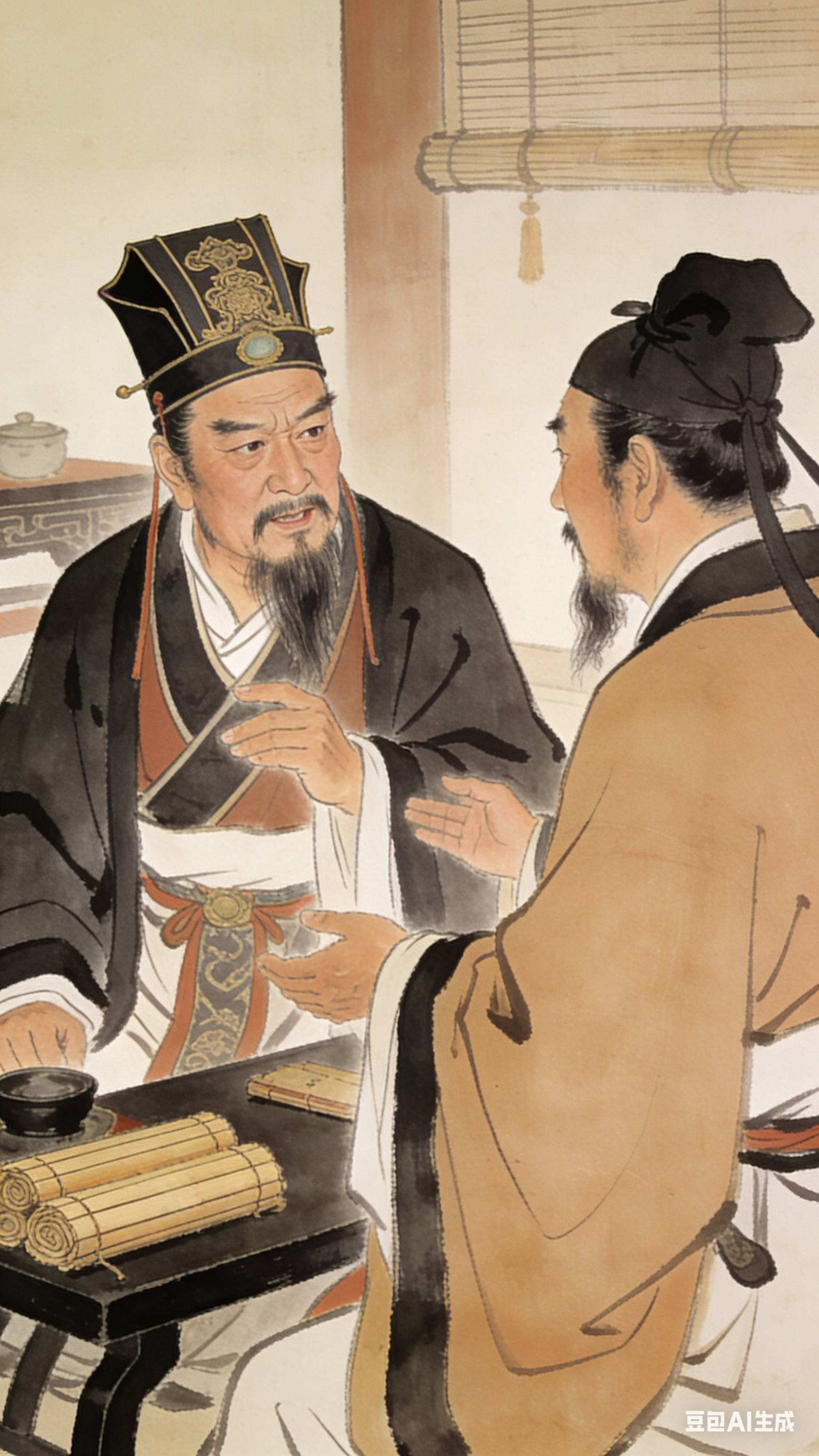 分鏡5:魯大夫臧文仲評論宋國將振興,畫面中臧文仲身著朝服,神情嚴肅地與人交談。