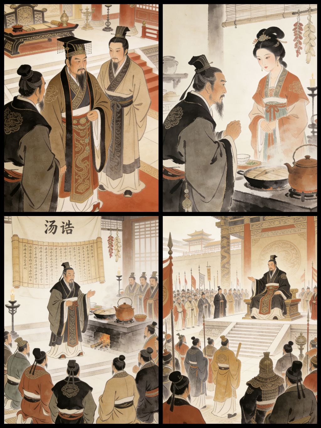 伊尹利用做廚師的機會,向商湯陳說天下大勢和治國之道。湯大喜,遂破格提拔他,后來伊尹便成為湯的右相。湯的左相仲虺原是夏王朝的高干子弟,本來可以過著養尊處優的生活,可是他不滿夏桀的暴虐,投奔商湯。伊尹和仲虺更成為商湯的左膀右臂,使商湯如虎添翼,更加銳不可當。