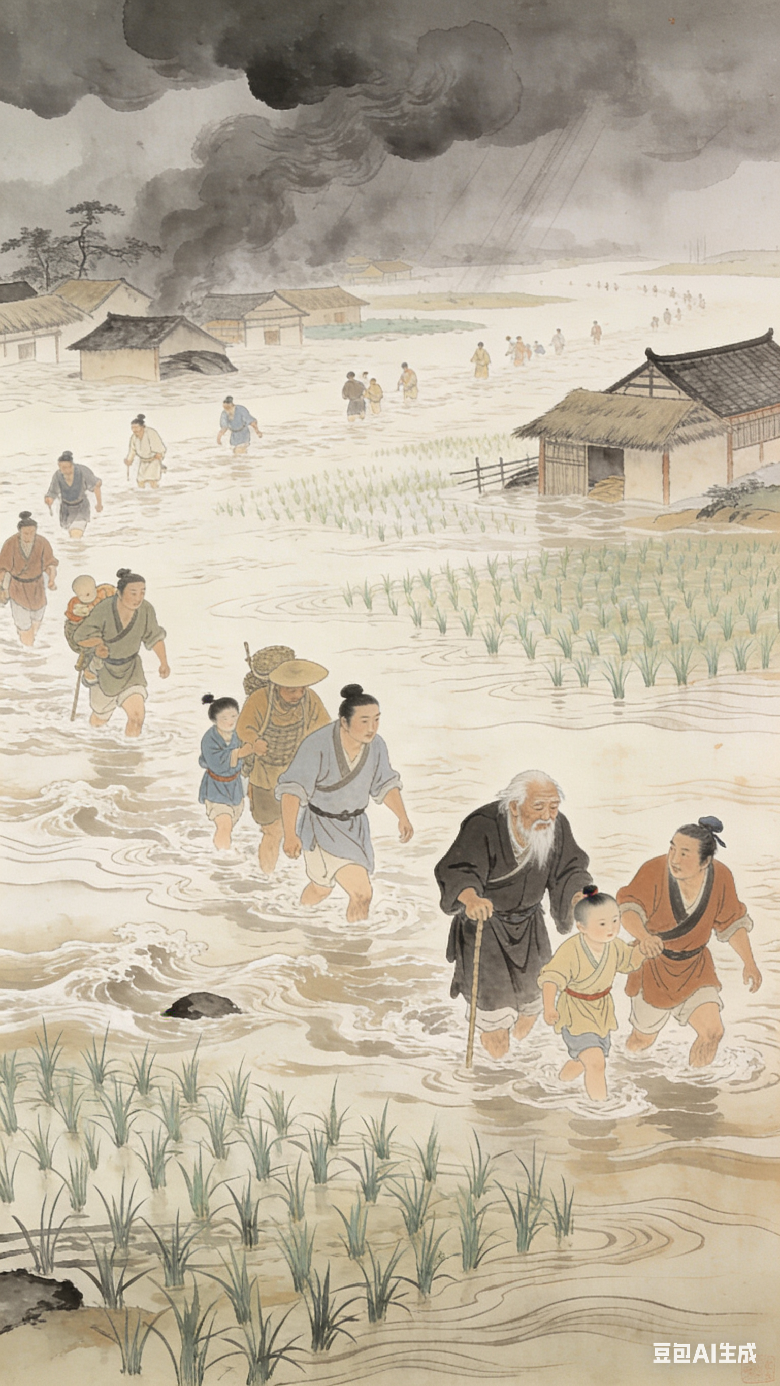 分鏡3:宋國連吃敗仗后遇大水,莊稼被淹,百姓受災,一片凄涼景象。