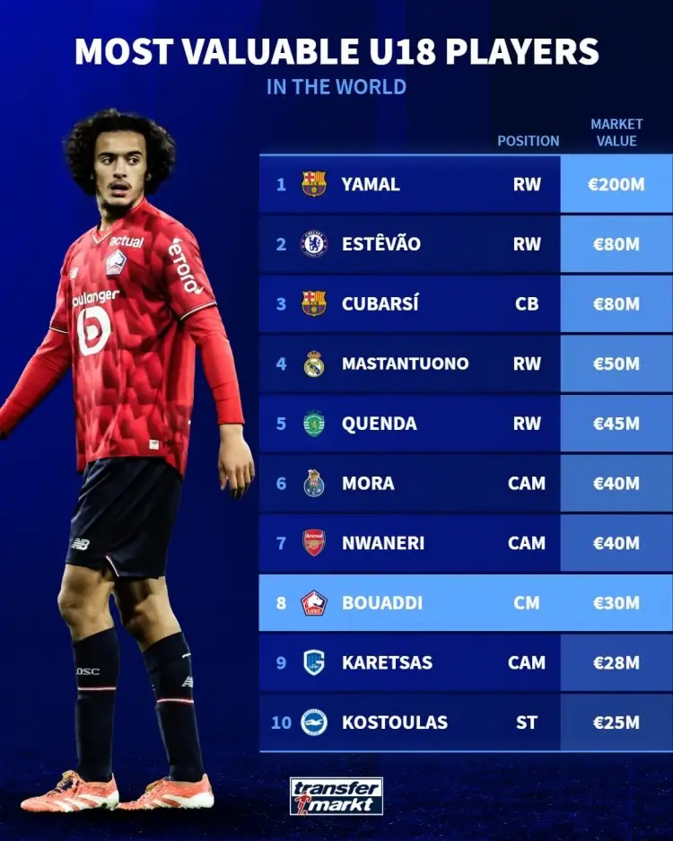 德國轉(zhuǎn)會市場列出了U18球員身價排名,亞馬爾2億歐居首, 埃斯特旺、庫巴西次席。