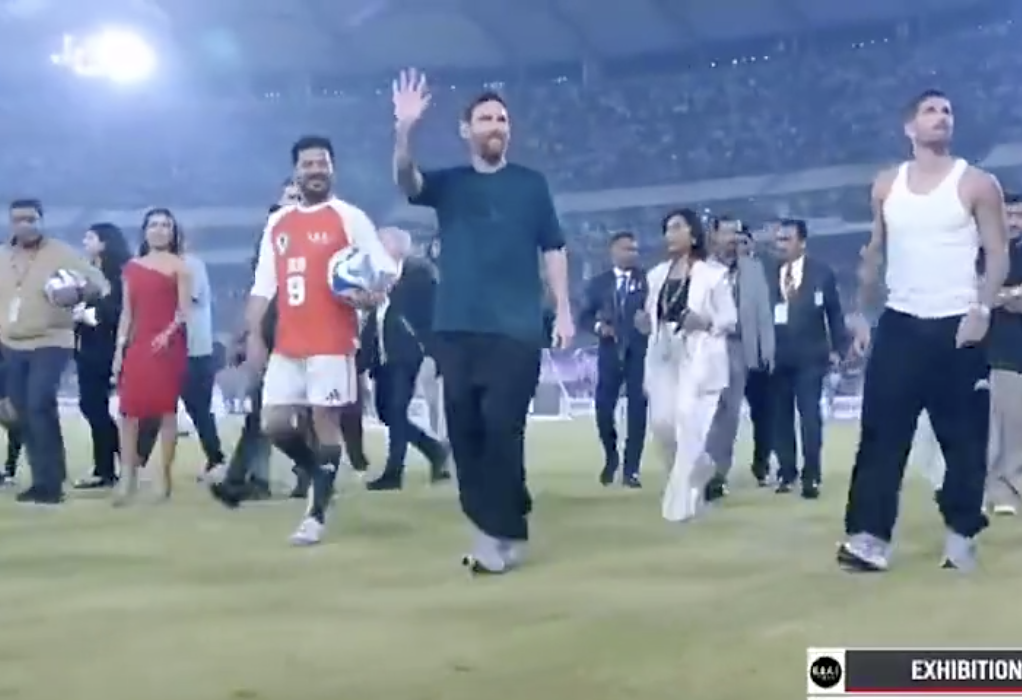 梅西離開后,球迷直接沖下看臺,對球場的設施進行了破壞,現場出現巨大騷亂。隨后,梅西乘坐飛機離開第一站,并順利抵達第二站特倫甘納邦的首府海得拉巴。和第一站相比,第二站的安保、流程以及互動安排都合理了許多。