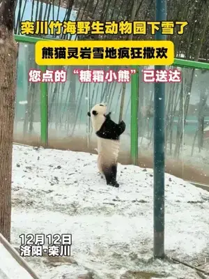 #欒川#竹海野生動物園 下雪了!#熊貓靈巖雪地瘋狂撒歡,您點的“糖霜小熊”已送達!#靈巖 (編輯:胡耀幗)