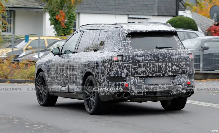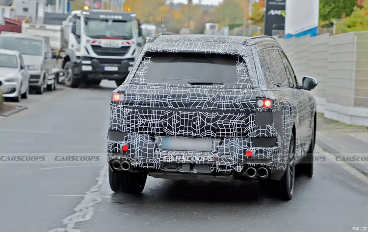 側(cè)面保留經(jīng)典門窗線條,大尺寸輪圈依舊是硬派標(biāo)配,同時首次引入隱藏式門把手,兼顧科技感與低風(fēng)阻。目前諜照中尾燈仍為臨時偽裝,但據(jù)推測可能采用類似iX3的全新家族式尾燈樣式;雙邊共兩出排氣布局則彰顯燃油版身份,運動感拉滿。