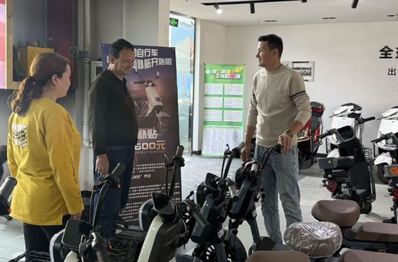 在沙雅縣一電動車銷售市場,消費者在咨詢以舊換新相關政策。(資料圖)