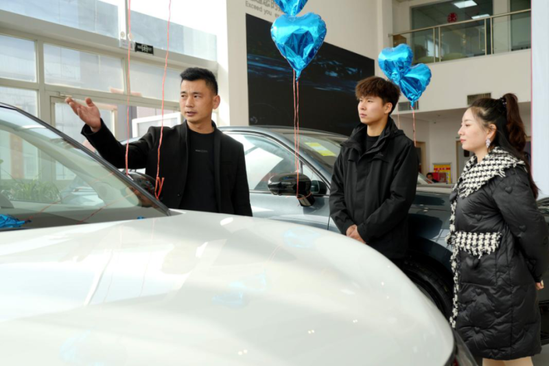 在溫宿縣大欣汽車城的一家品牌汽車4S店,工作人員為客戶介紹新款車型和優惠政策。(資料圖)