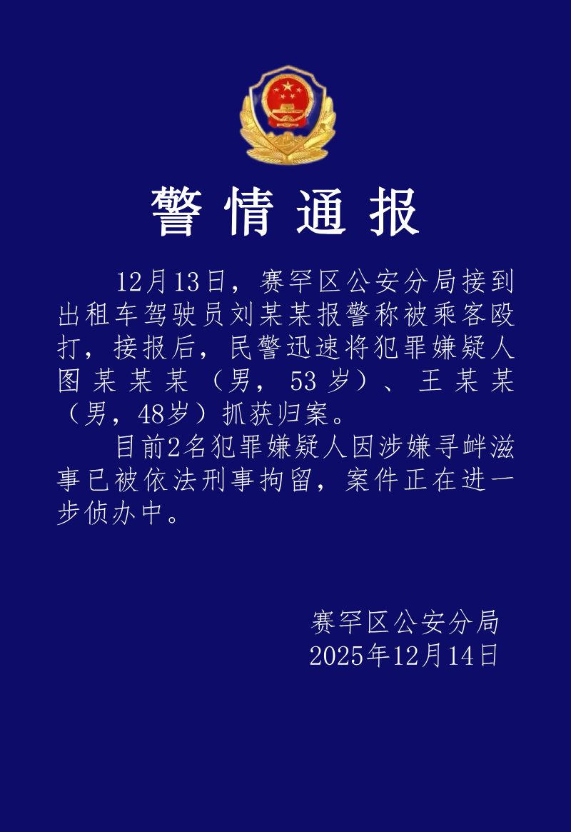 12月13日,賽罕區(qū)公安分局接到出租車駕駛員劉某某報警稱被乘客毆打,接報后,民警迅速將犯罪嫌疑人圖某某某(男,53歲)、王某某(男,48歲)抓獲歸案。