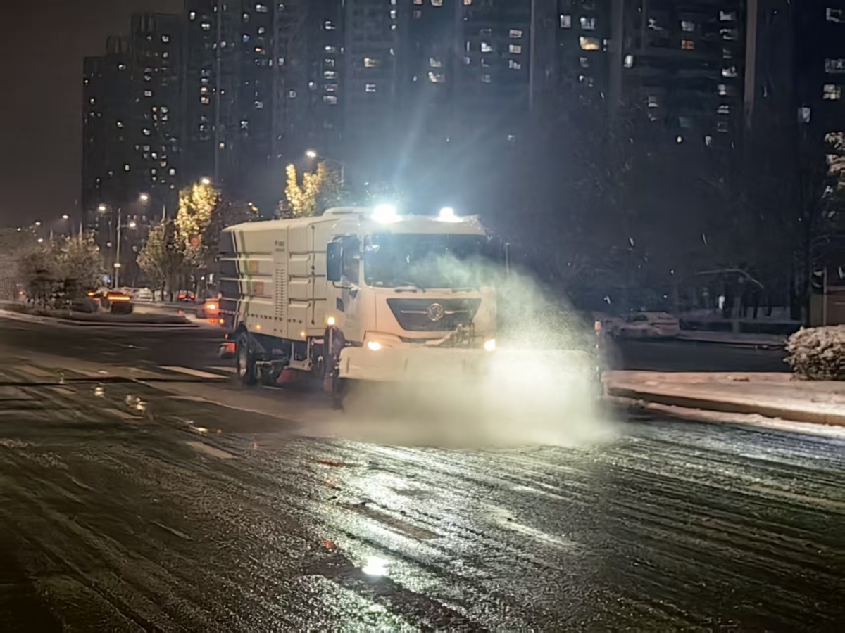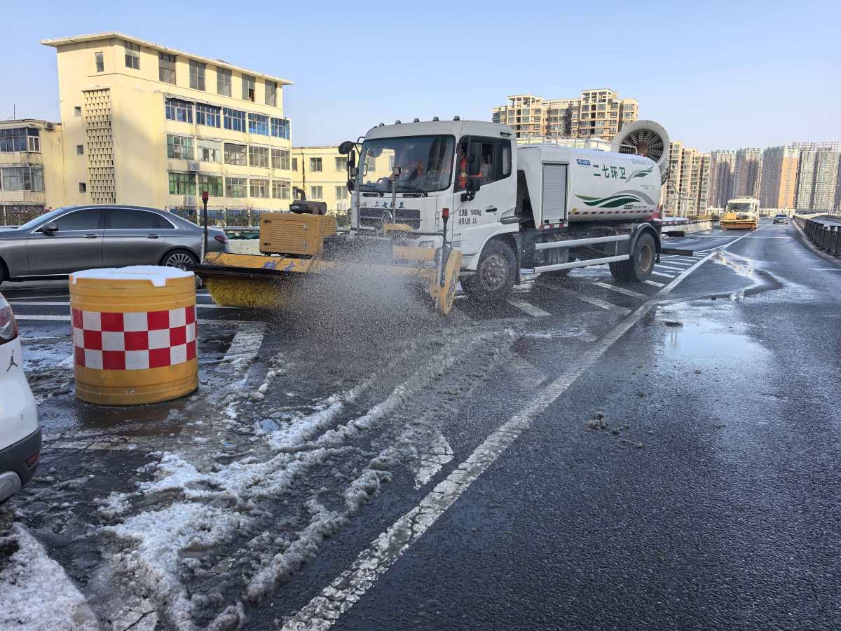 截至目前,嵩山路、京廣路、大學路等14條重要主次干道已完成清除冰雪作業,河醫(二橋、三橋)及解放路立交橋等易結冰路段均已撒布融雪劑,累計共出動人員2300余人、撒布機30臺、雪滾40臺、雪鏟18臺、鏟車20臺,使用融雪劑約650噸。